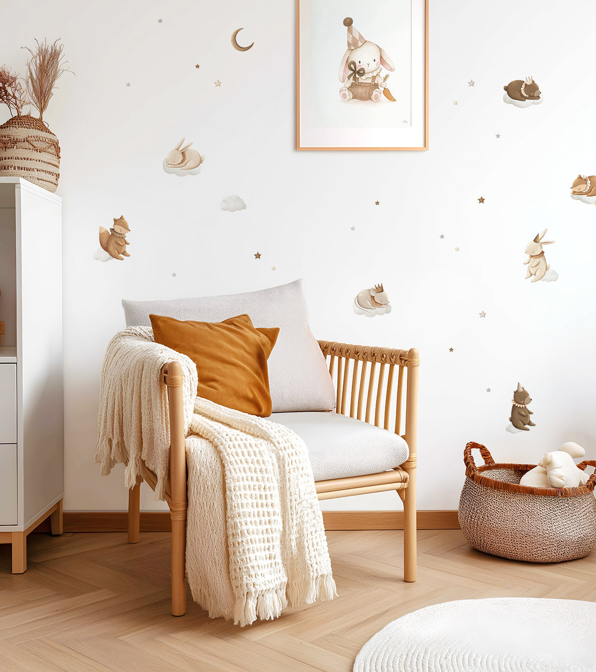 The Cloudy Tales theme creates a poetic and soothing atmosphere for the nursery, with hot air balloons, little animals, and clouds that spark imagination while promoting calm. Its soft palette of beige, white, and cream wraps the room in a cozy warmth, making the nursery a chic and comfortable retreat.