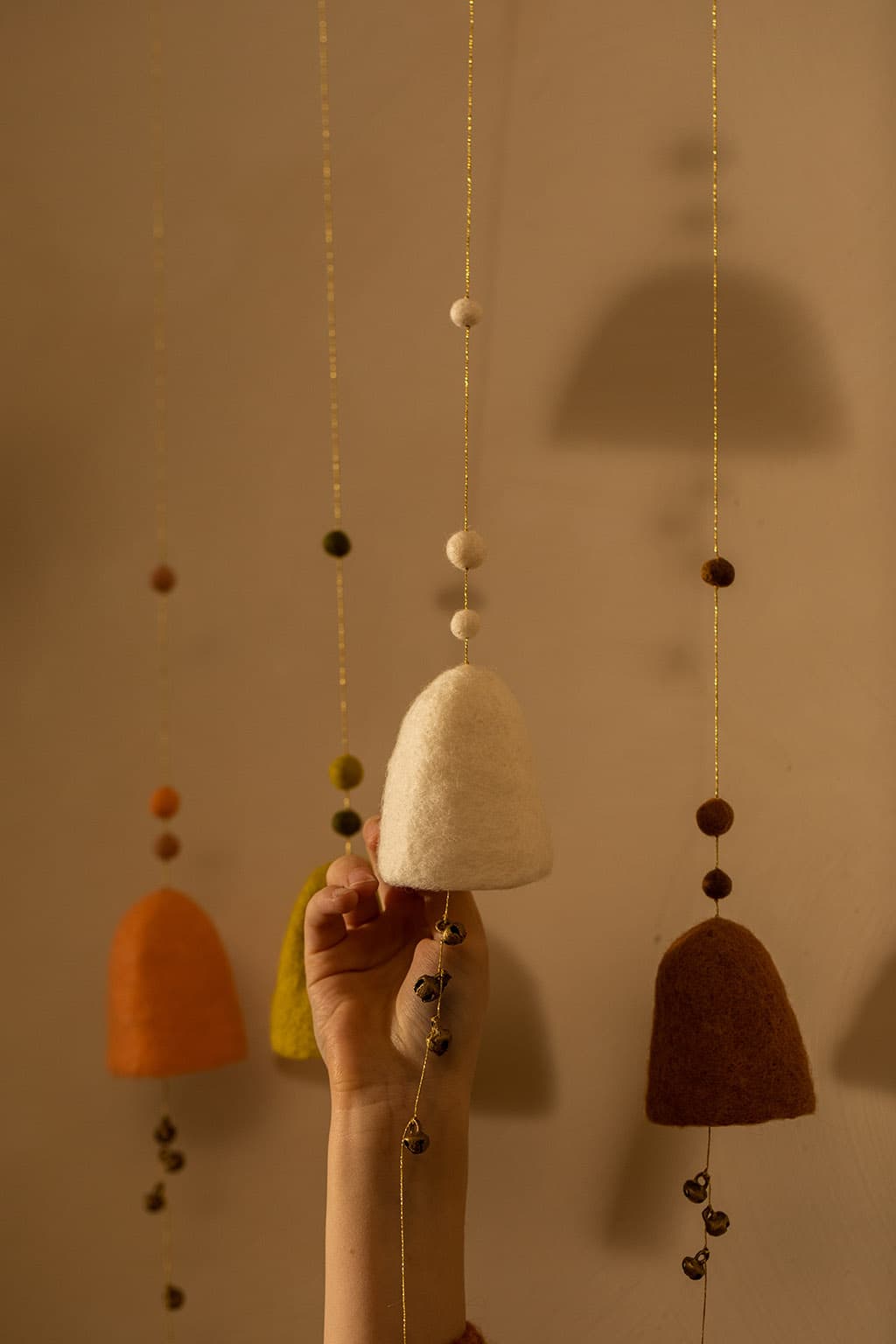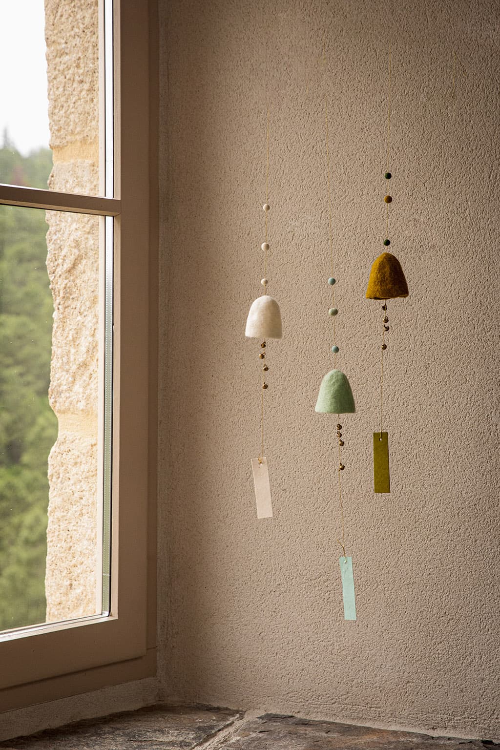 Inspired by the bells of Nepalese temples, MUSKHANE has created its WIND BELL by combining felt, brass bells and Nepalese paper. Entirely handmade in our workshops, this pairing of materials creates a decorative and poetic accessory that will radiate throughout the room you hang it in!