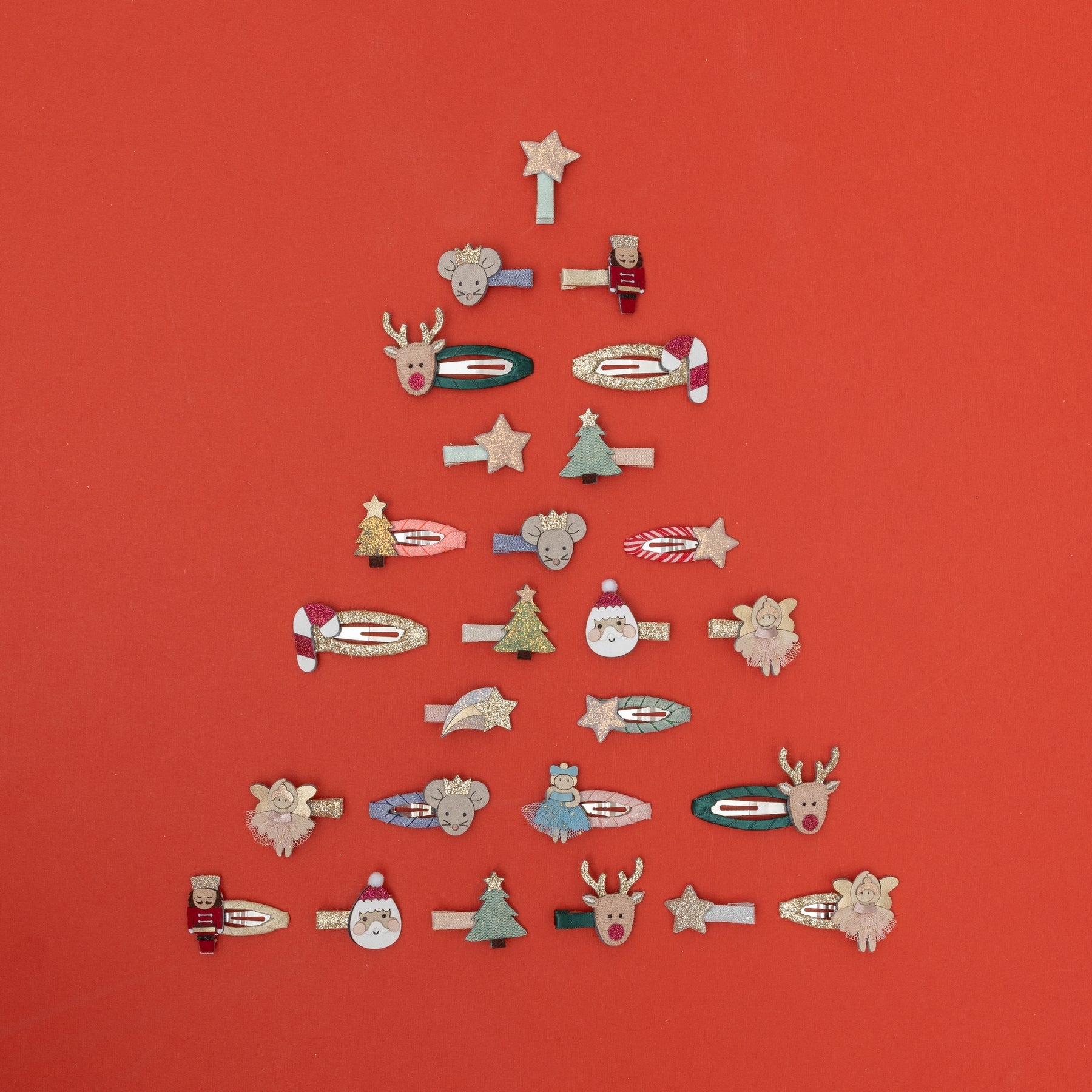 • Clips adorned with tiny nutcracker, fairy, ballerina, mouse and a sparkling star all intricately crafted from a pretty combination of matt, metallic and glitter fabrics