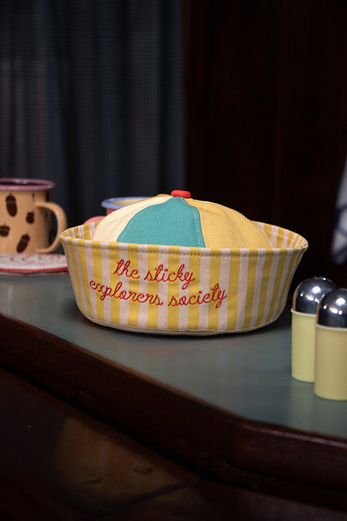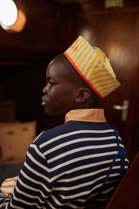 Join the Sticky Explorers Society by wearing this boat hat. It has 6 panels in 3 different colors and a striped rim with embroidery on the frond and back.