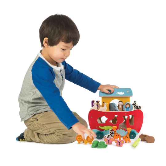 Noah's Ark has removable roof panels and side panels lift up to allow little hands to collect the chunky wooden animals.
