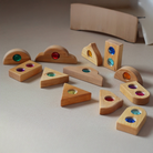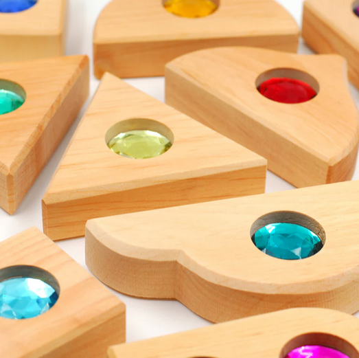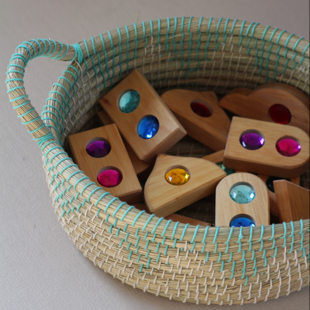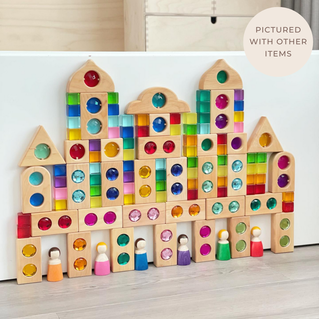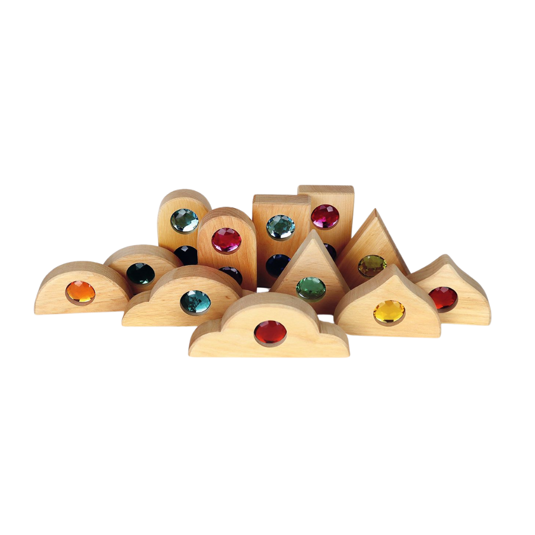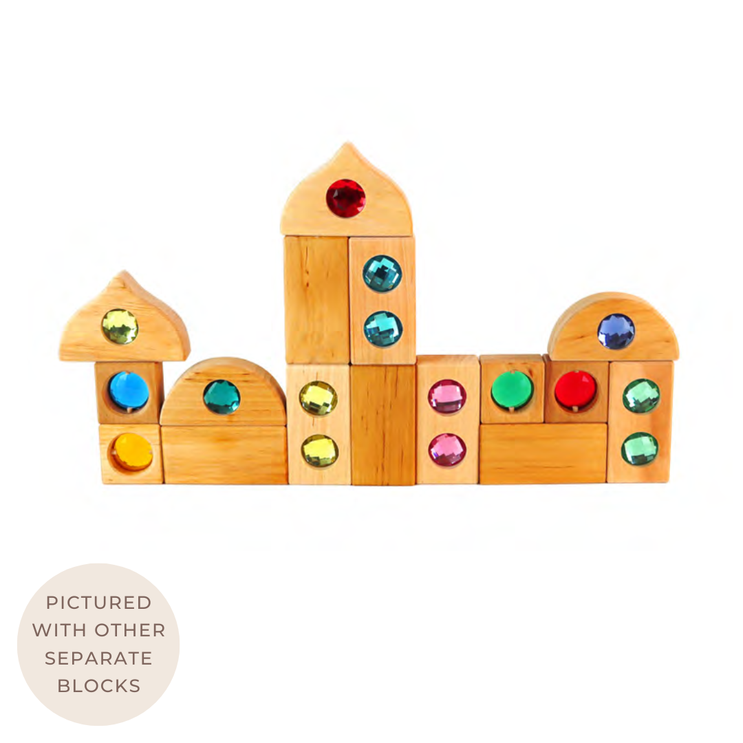 Playing with light and colour, this  wooden block set of roofs, with bright coloured inlaid jewel windows will bring a magical quality to the creation of imaginative constructed worlds.