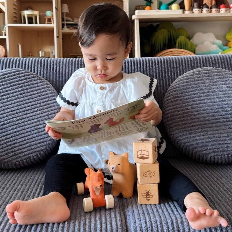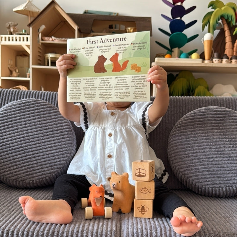 Step into a storybook world with the First Adventure SET, a lovingly handcrafted collection created to inspire your child’s very first steps into imaginative play. With a Curious Bear, a Rolling Fox, and three engraved Wooden Cubes, this set transforms early play into a meaningful adventure.