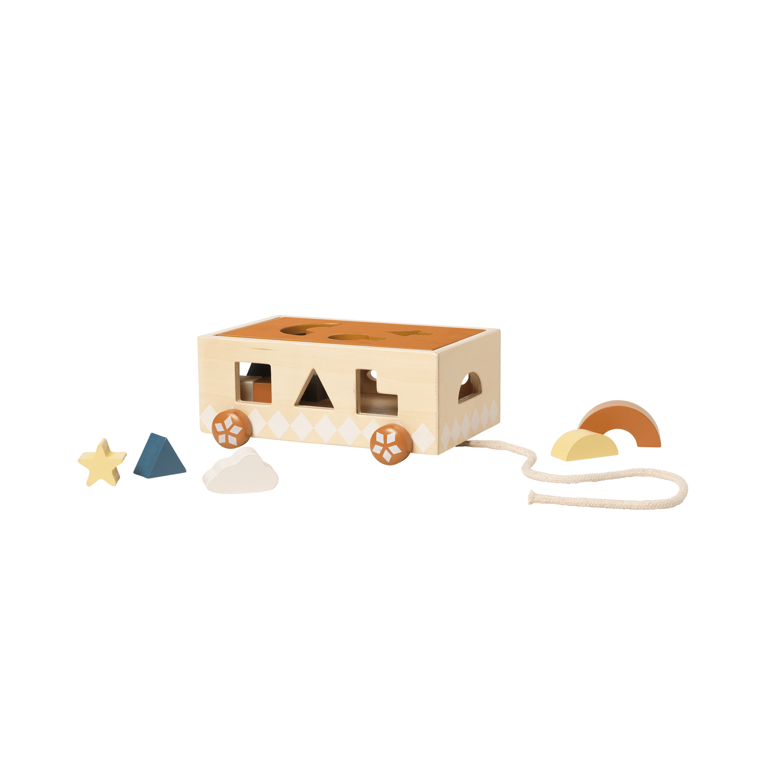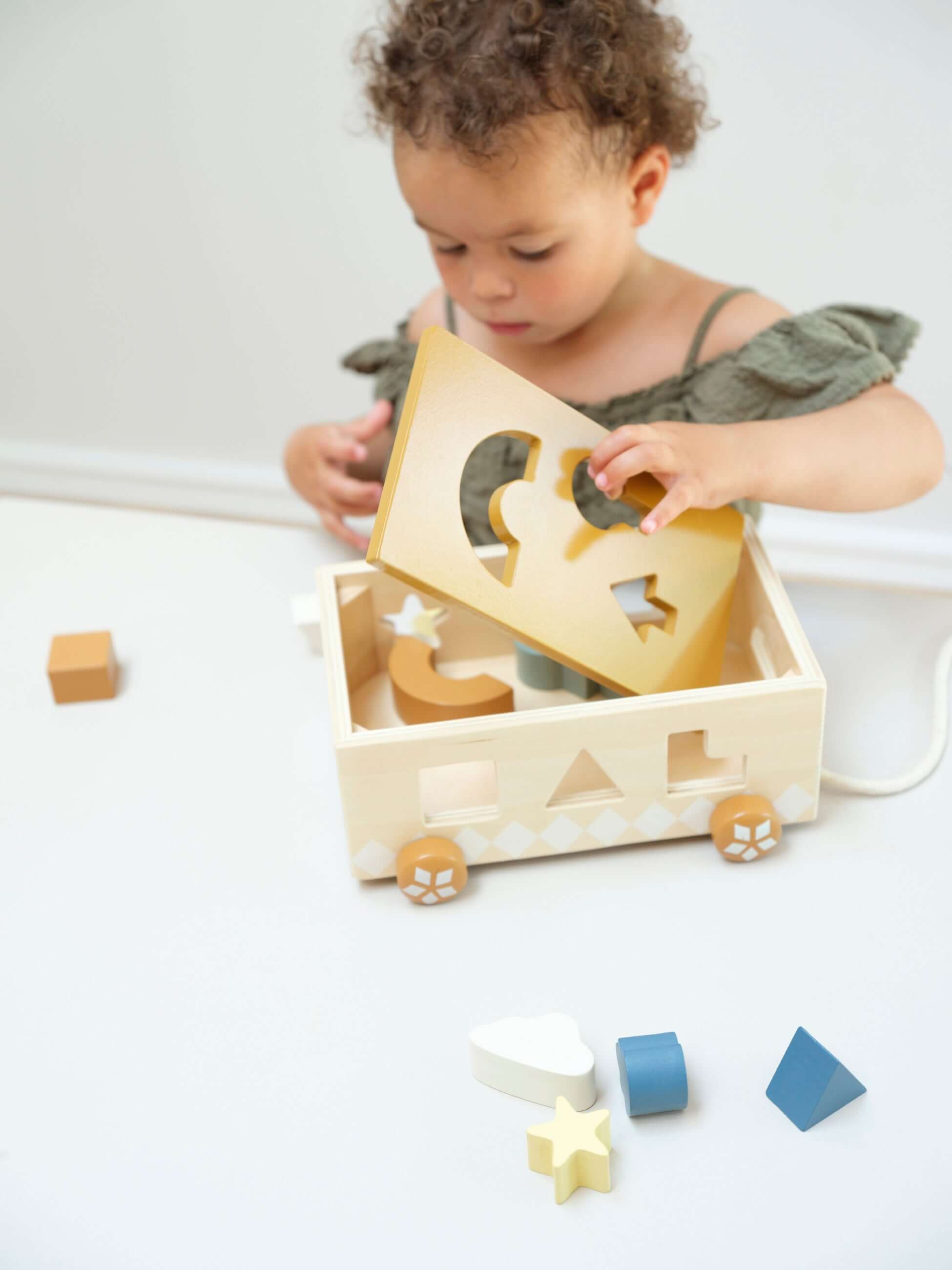 Fabelab's Shape Sorter Cart with different geometric shapes stimulates hand-eye coordination and encourages your child to recognise shapes.