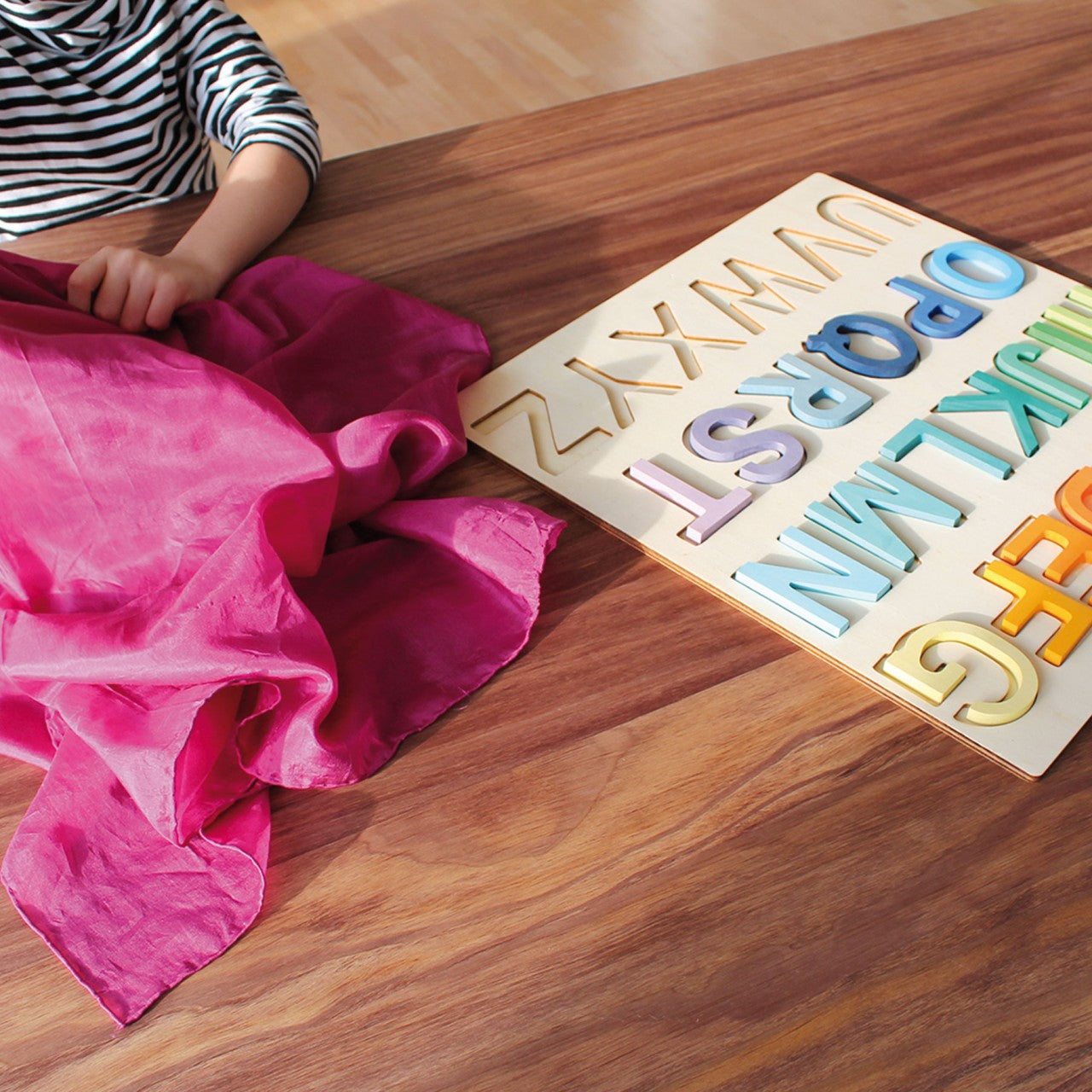 Cover the letters with a silk scarf and let the children only feel them: it is a challenge to find the next one.