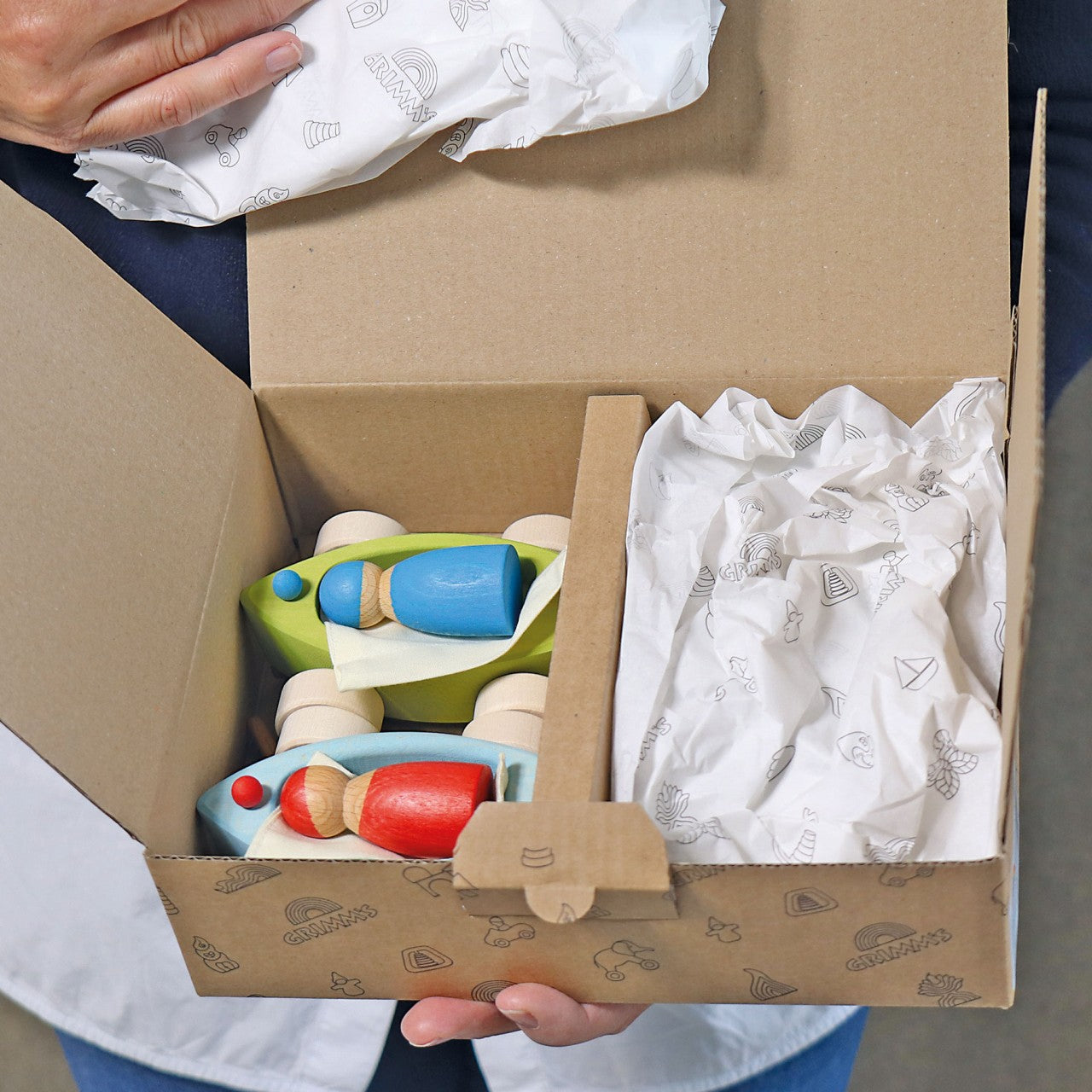 With this small sailing fleet there is a lot to discover when you explore the play worlds created by small world builders. After all, each little boat is just as suitable for off-road use in sand as it is on carpeted and wooden floors. Young explorers will also discover that the sailing fleet also floats wonderfully on water, which is due to the natural buoyancy of wood.