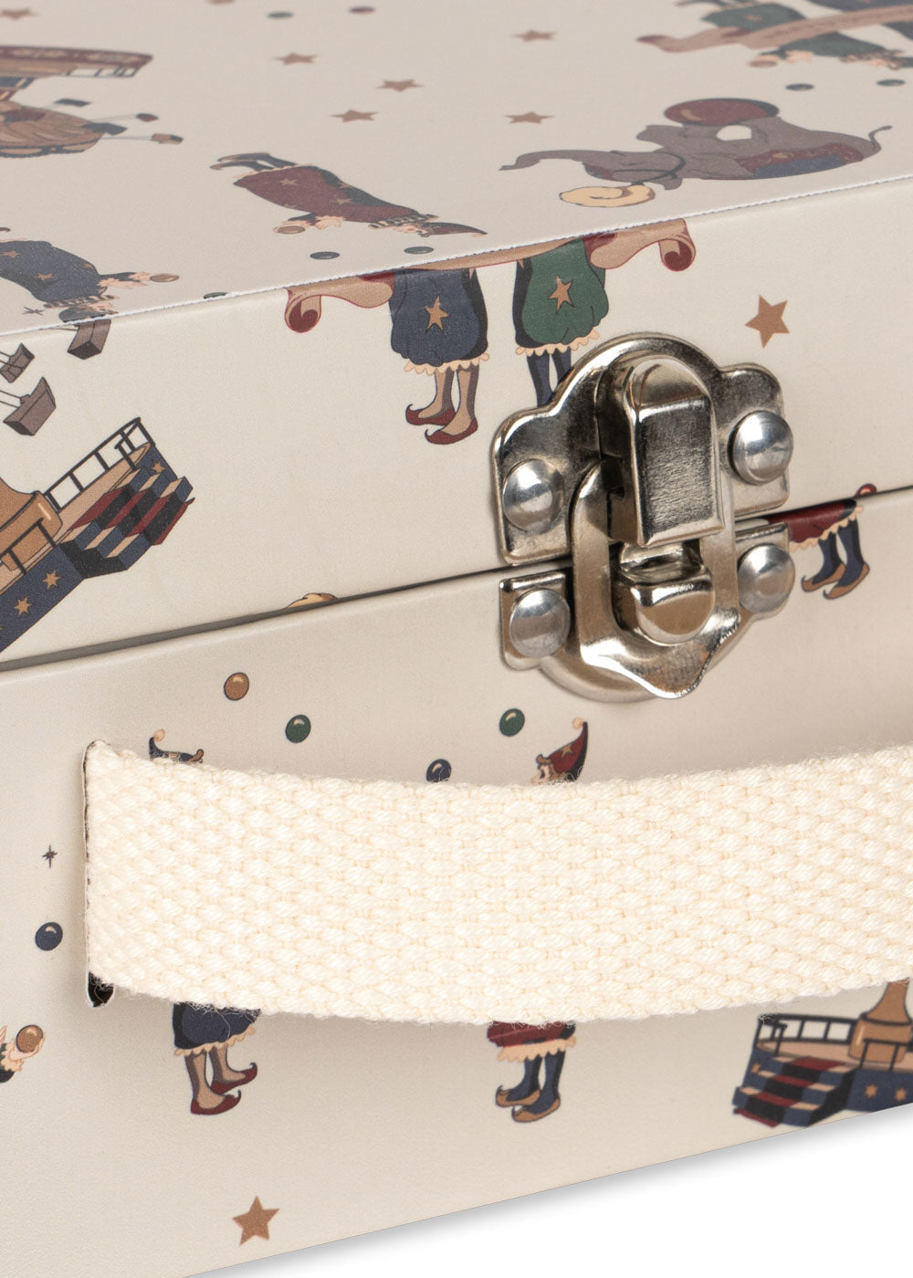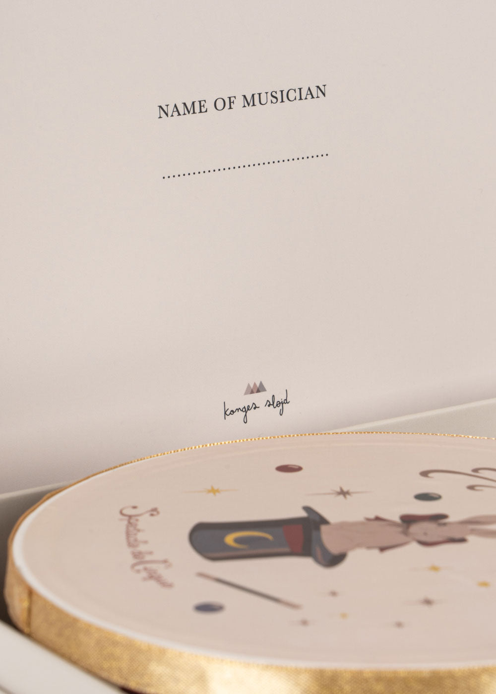 Set of wooden music instruments, including tambourine, castanet, maracas, and a xylophone with drumsticks. The instruments live in a cute little suitcase that is ideal for storage.