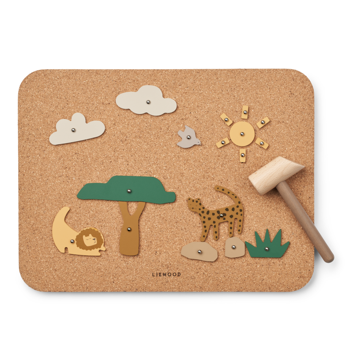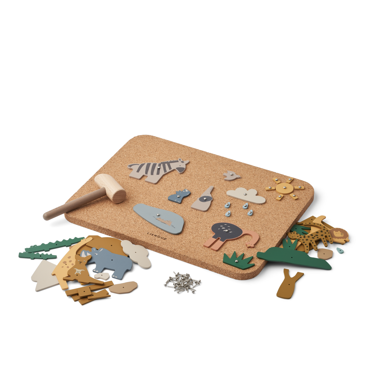 Wooden pin board for fun and creativity. Features the signature All Together animals. Use the hammer and nails to attach to the board. Board made of soft of flexible cork for easy handling.