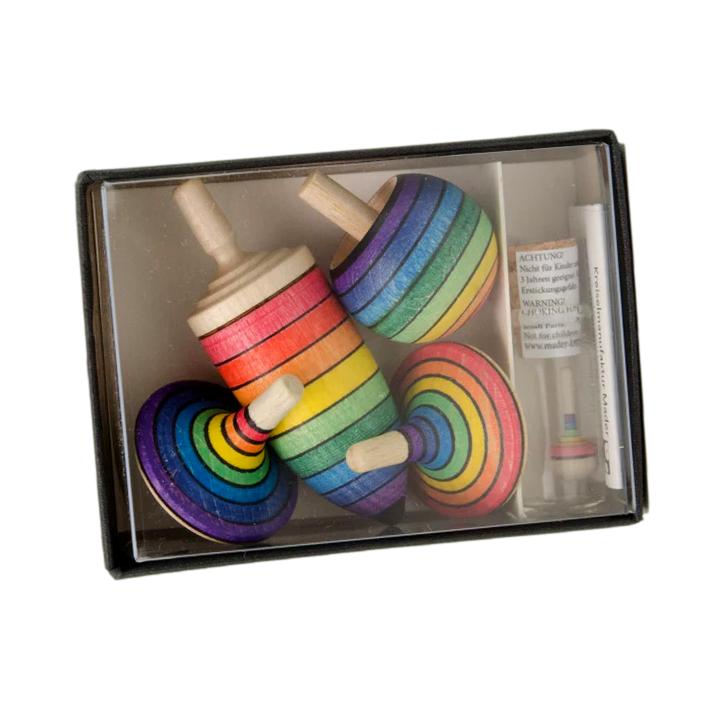 The Mader Spinning Top Learning Set Rainbow is the way to go. A set of 5 wooden spinning tops of varying difficulties which includes: 2x Rallyes, 1x Miniature, 1x Turn-over Top, 1x Barrel.