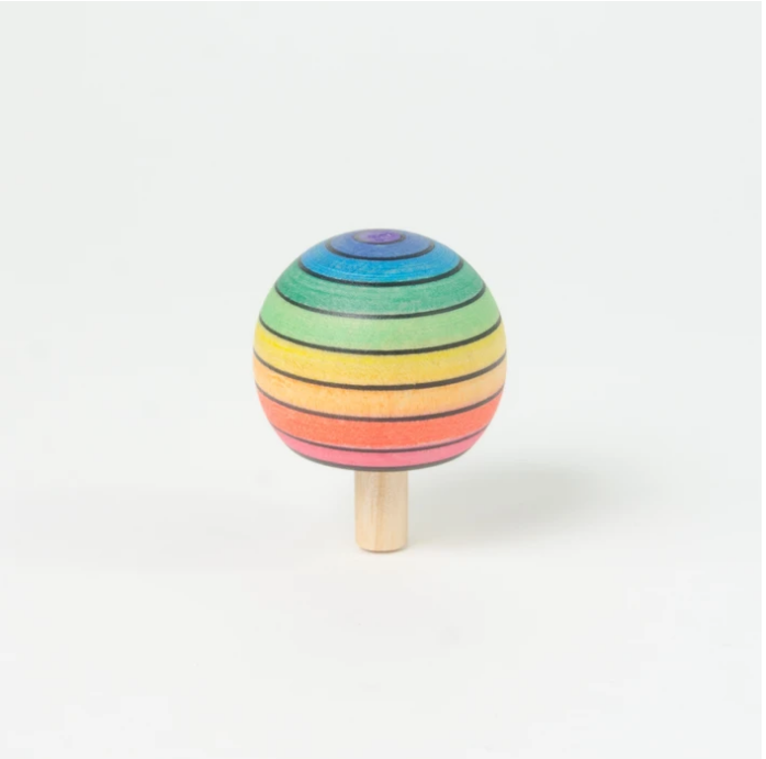 Mader Spinning "Turnaround" or "Turn-Over" tops are physically special wooden tops. You will be completely surprised when the spinning top turns upside down while it spins to finish on the tip of the handle. Mader Spinning Turn Top Rainbow is hand crafted from a single piece of wood and painted in a beautiful design of rainbow colours.