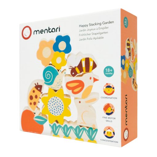 Our Happy Stacking Garden includes a row of carrots, a sunflower, flowers, a bee, a ladybird, a snail, an apple, a bird, and a rabbit, nicely packed in an illustrated drawstring bag.