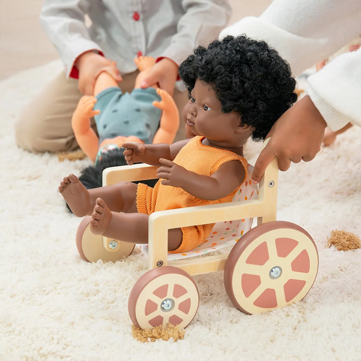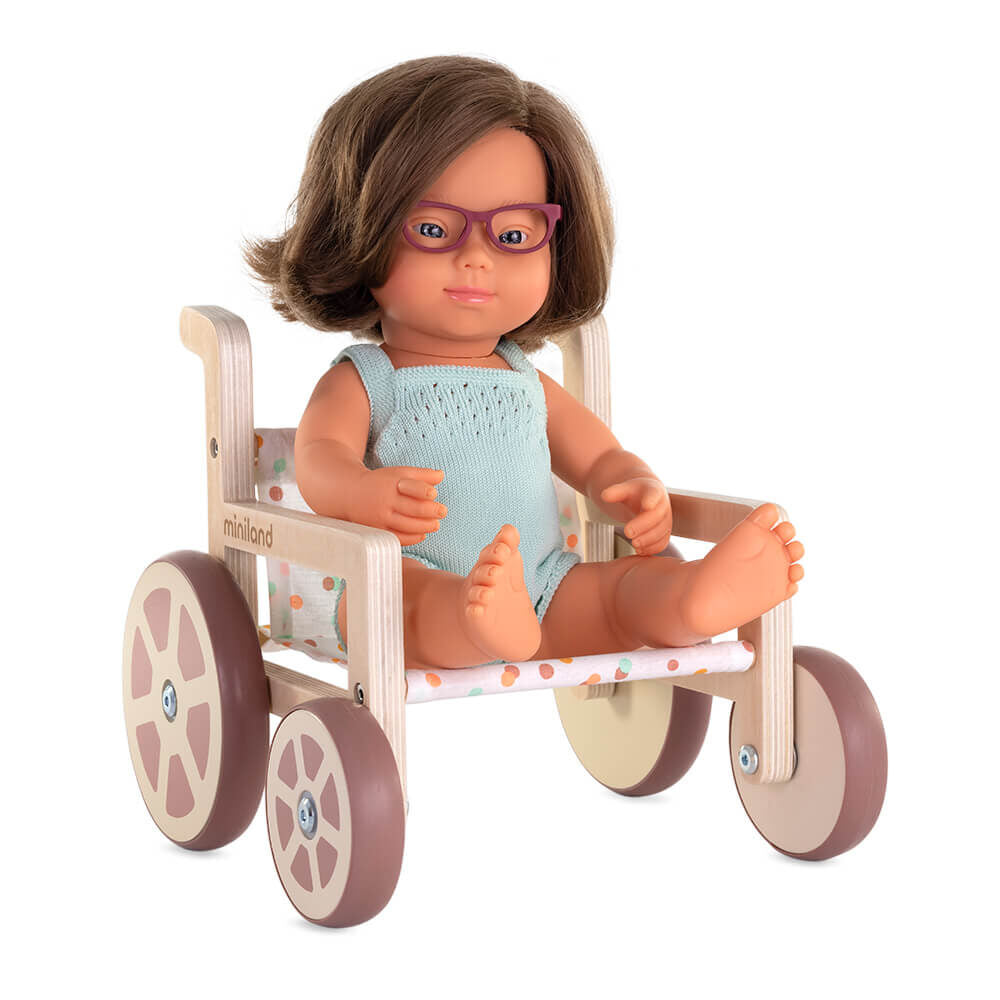 Wheelchair suitable for dolls up to 38cm, made from FSC-certified wood for environmental responsibility. It includes silent wheels, which make it ideal for children's group play or collective use.