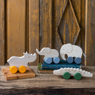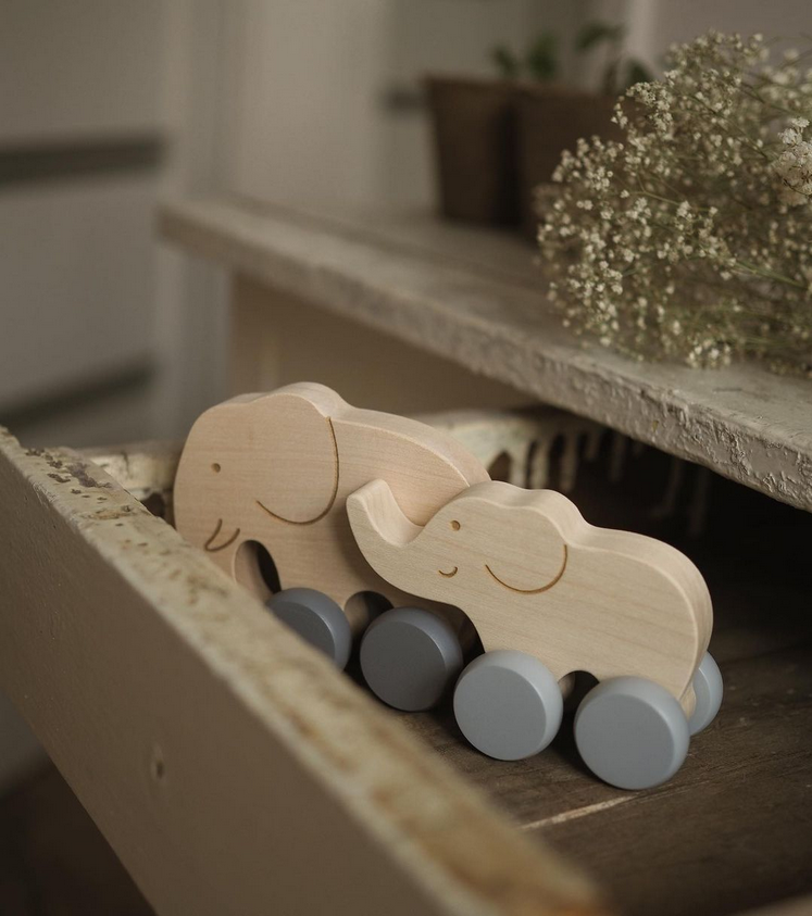 A push toy. Mother elephant with her calf. The two toys can be connected together, the baby grabs his mother by the tail.