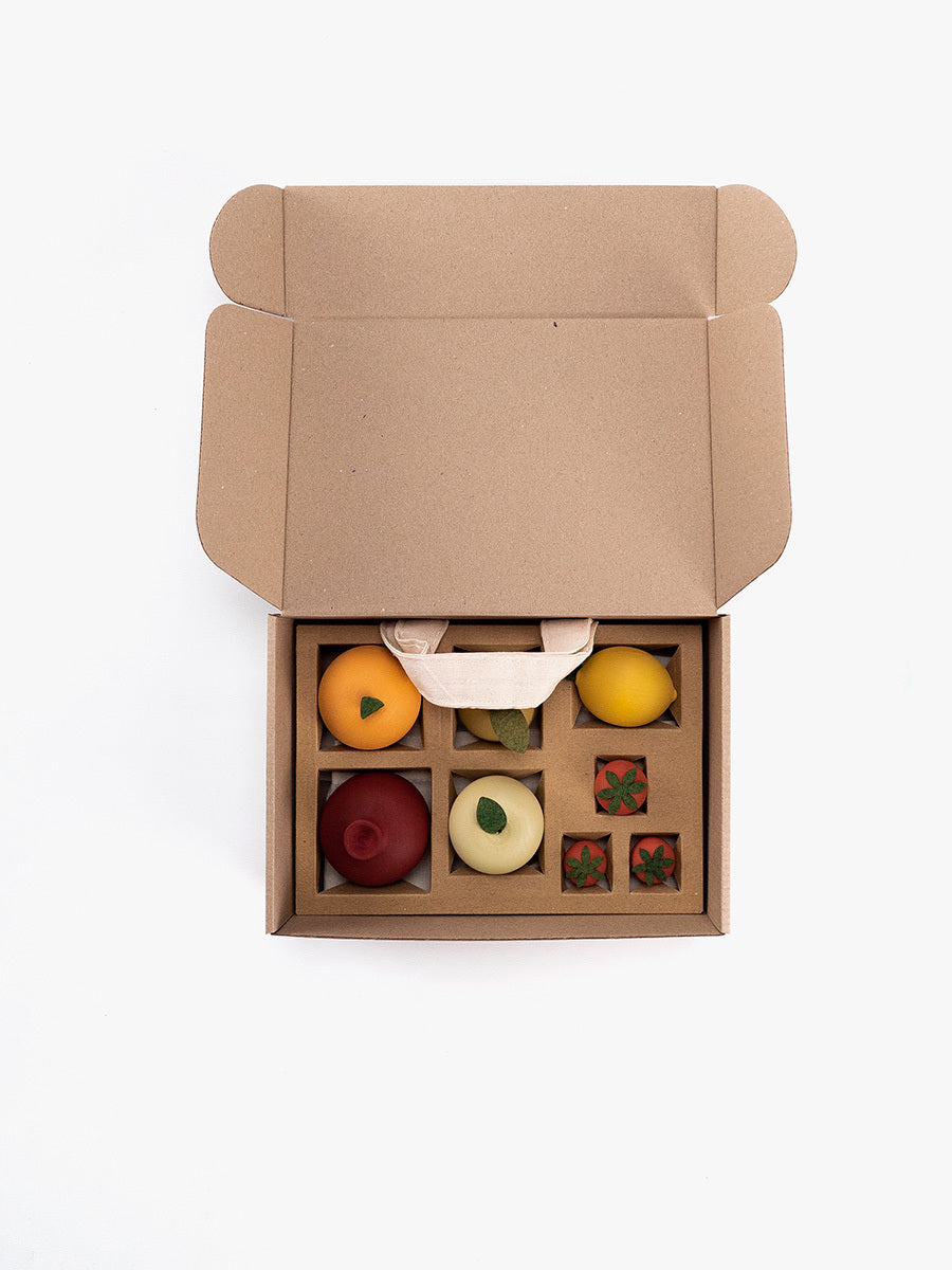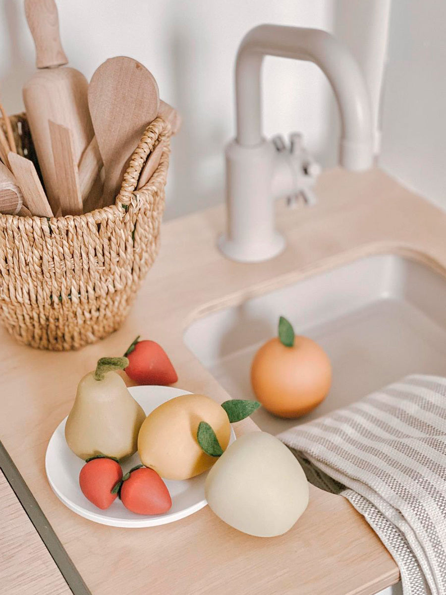 For example, playing with fruit & vegetables sets they act going to the grocery and interacting with the shop-assistant, or play the role of seller. This helps children to broaden their language skills and prepare for such interaction in real life.