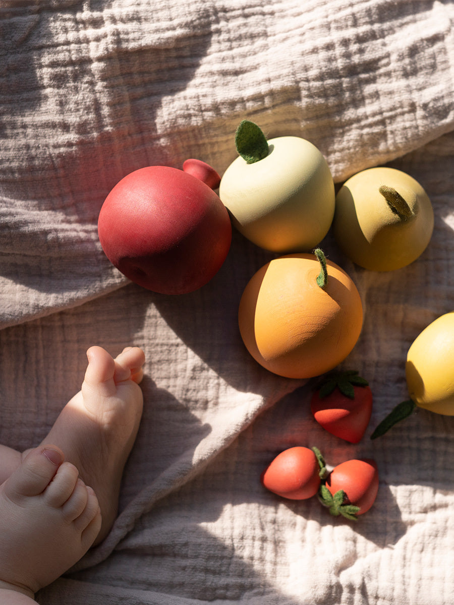 All are made from wood and covered with water-based paint - absolutely safe for children. The fruit are carefully sanded, so they are nice to touch.