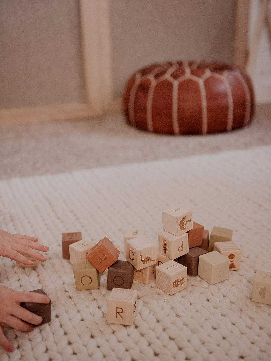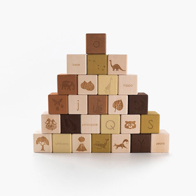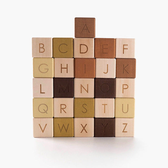 Each block features four engraved sides showing an illustration, uppercase letter, lowercase letter and a word matching the alphabet letter they represent - with two plain sides top and bottom.