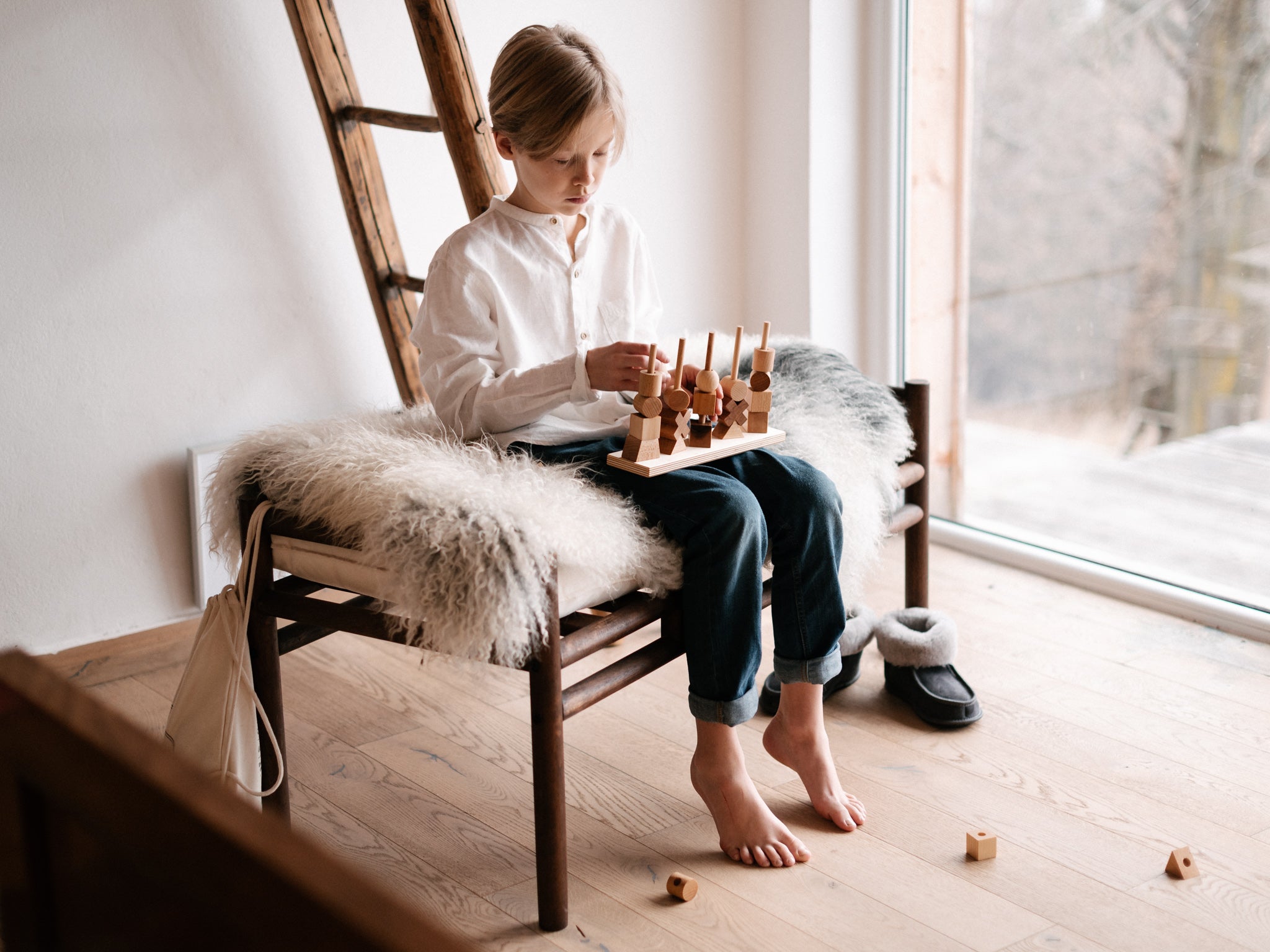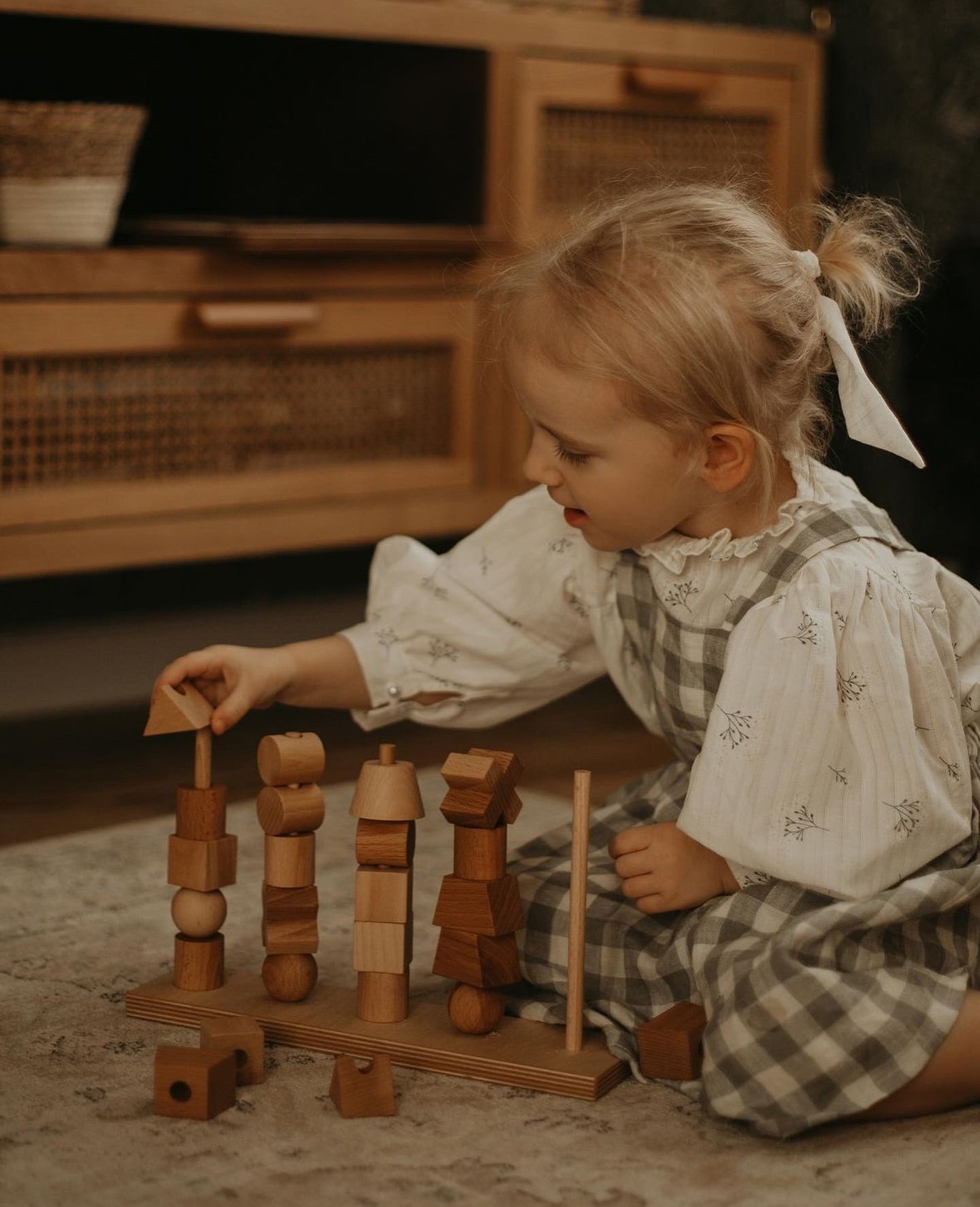 Stacking Montessori Toy. Can you help the figures to climb up the fence? How would you like to arrange them? Exercise your senses while playing! Touch – wood so soft from beeswax and botanical oils. Sight – natural colours of various types of wood. Close your eyes... smell the wood. So beautiful, so soft from nature!