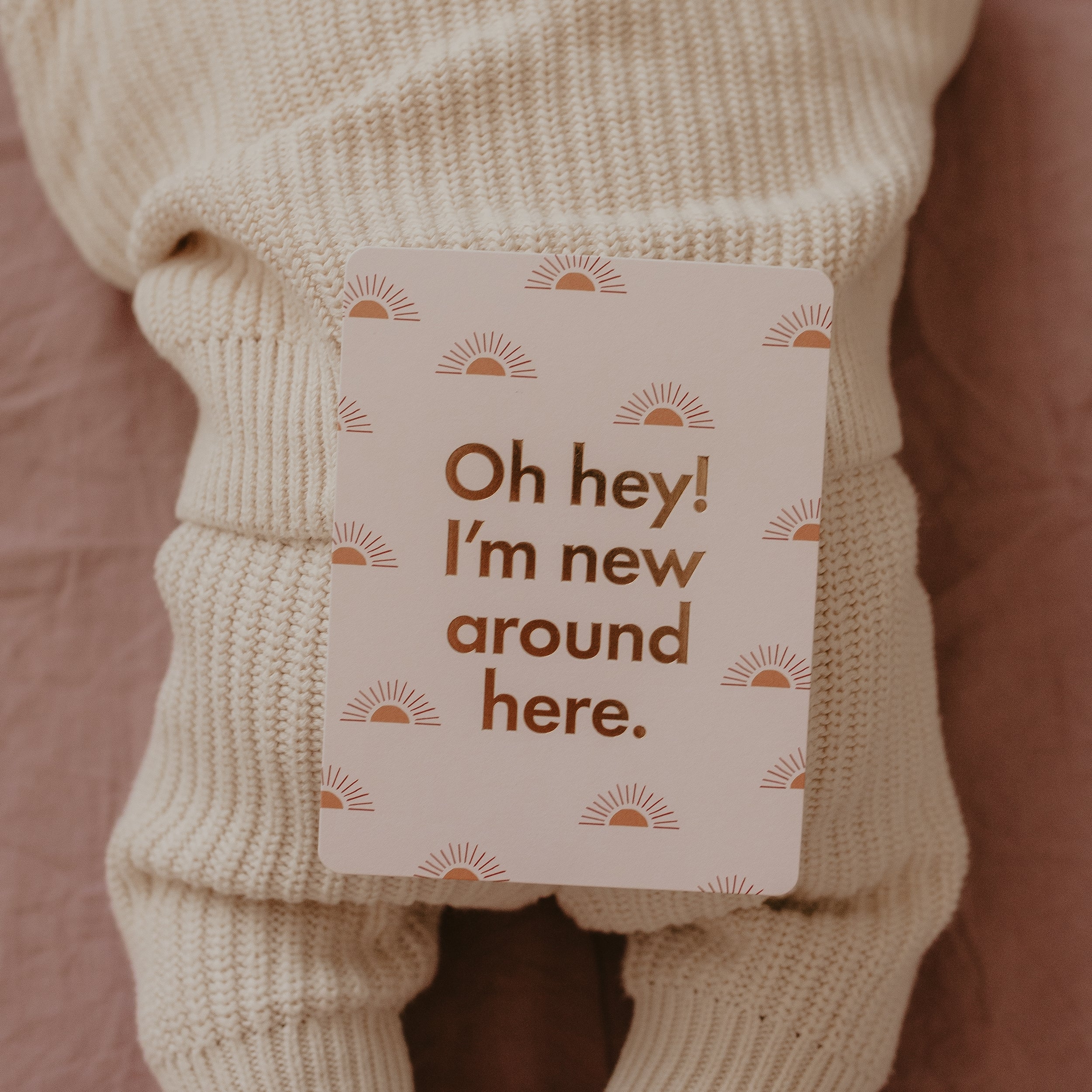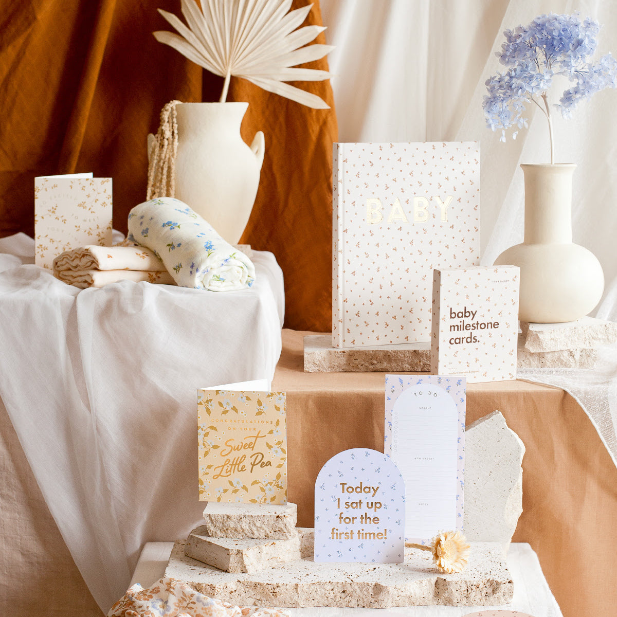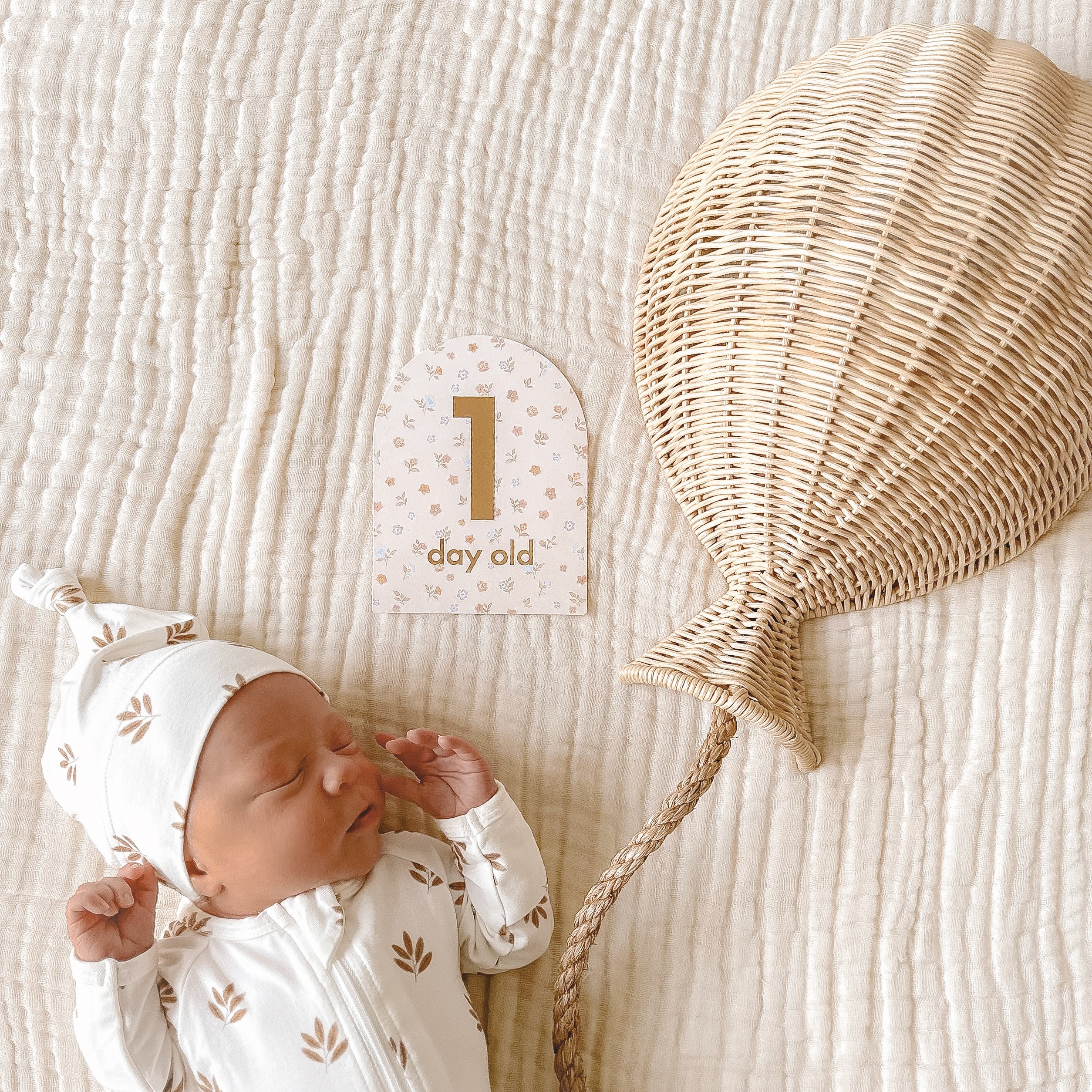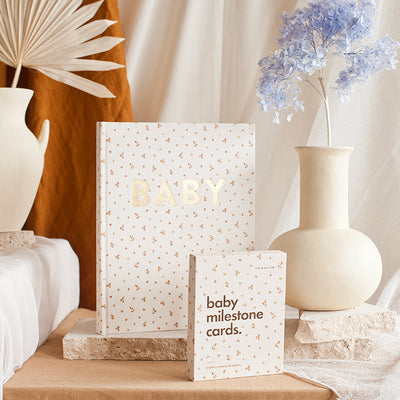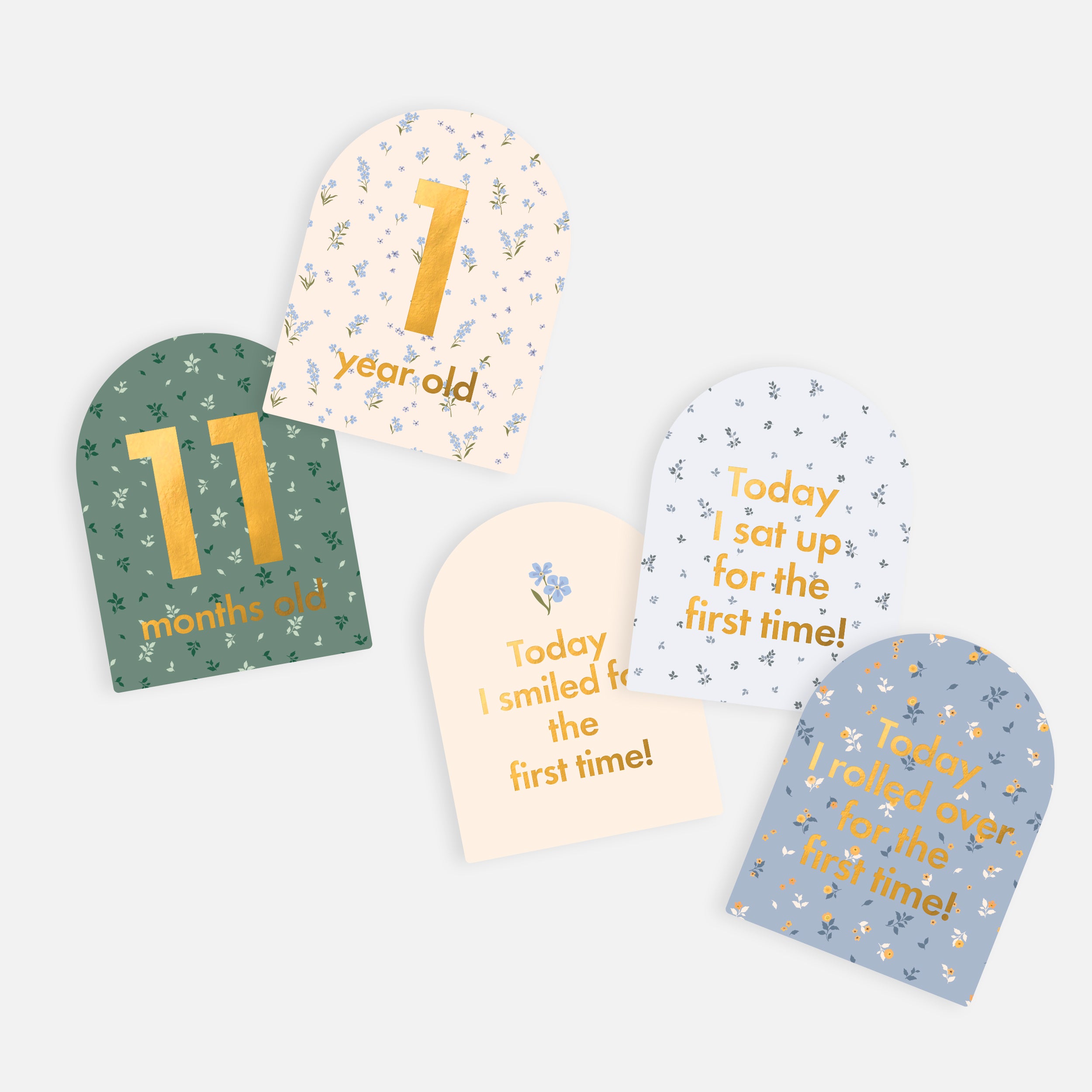 Includes 34 cards in a stunning arch shape with rounded corners safe for little hands, a special card for your birth announcement, plus all the important milestones from one day old to one year old. Each card features a beautiful vintage-inspired print from the Broderie Collection with gold foil on every card.