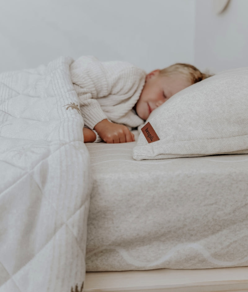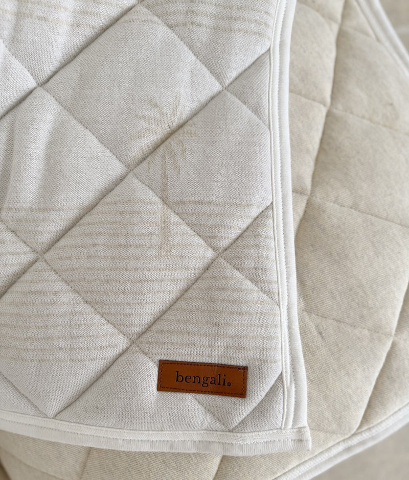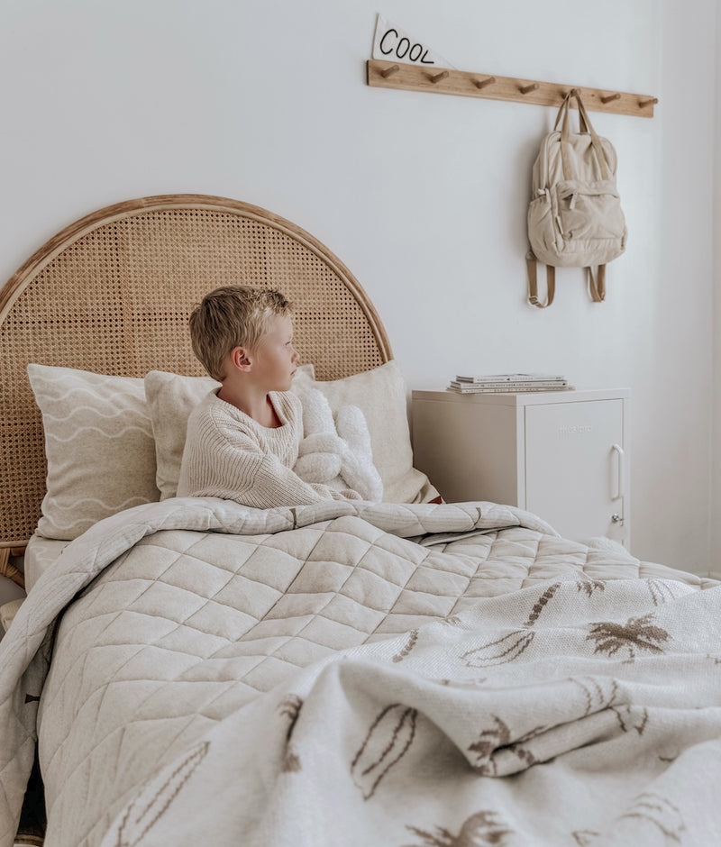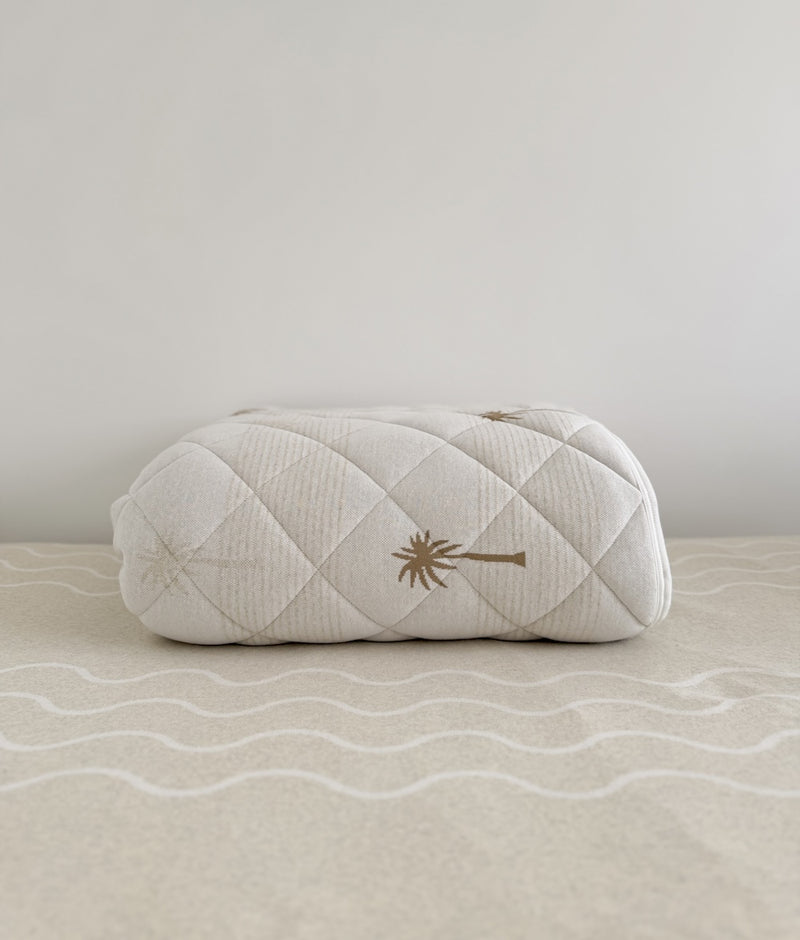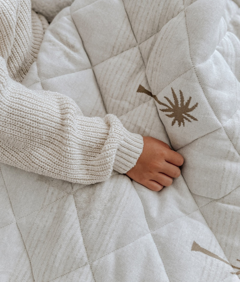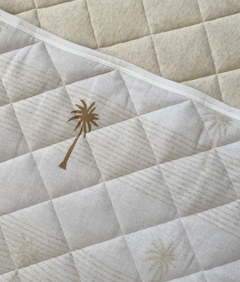 The Natural and Ivory Palma Quilt features a subtle waved marle design with khaki palm trees, bringing a coastal-inspired vibe to your nursery, kids' room, or bedroom. The reverse is a plain natural marle, offering a versatile, neutral look. This beautiful quilt combines a warm, inviting design with maximum comfort, perfect for all seasons.