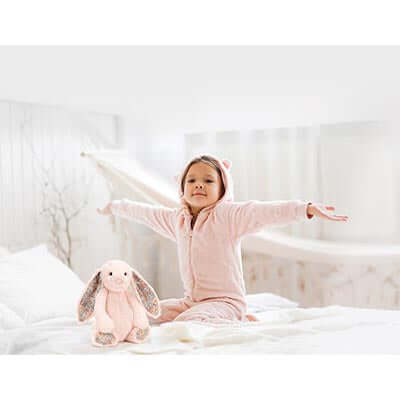 Blossom Blush Bunny can't wait to join the picnic - this bobtail bopper has even brought some flowers! Dreamy-soft in warm peach fur, with a pink bobble nose and blossom ears and paws, this bunny brings the springtime.