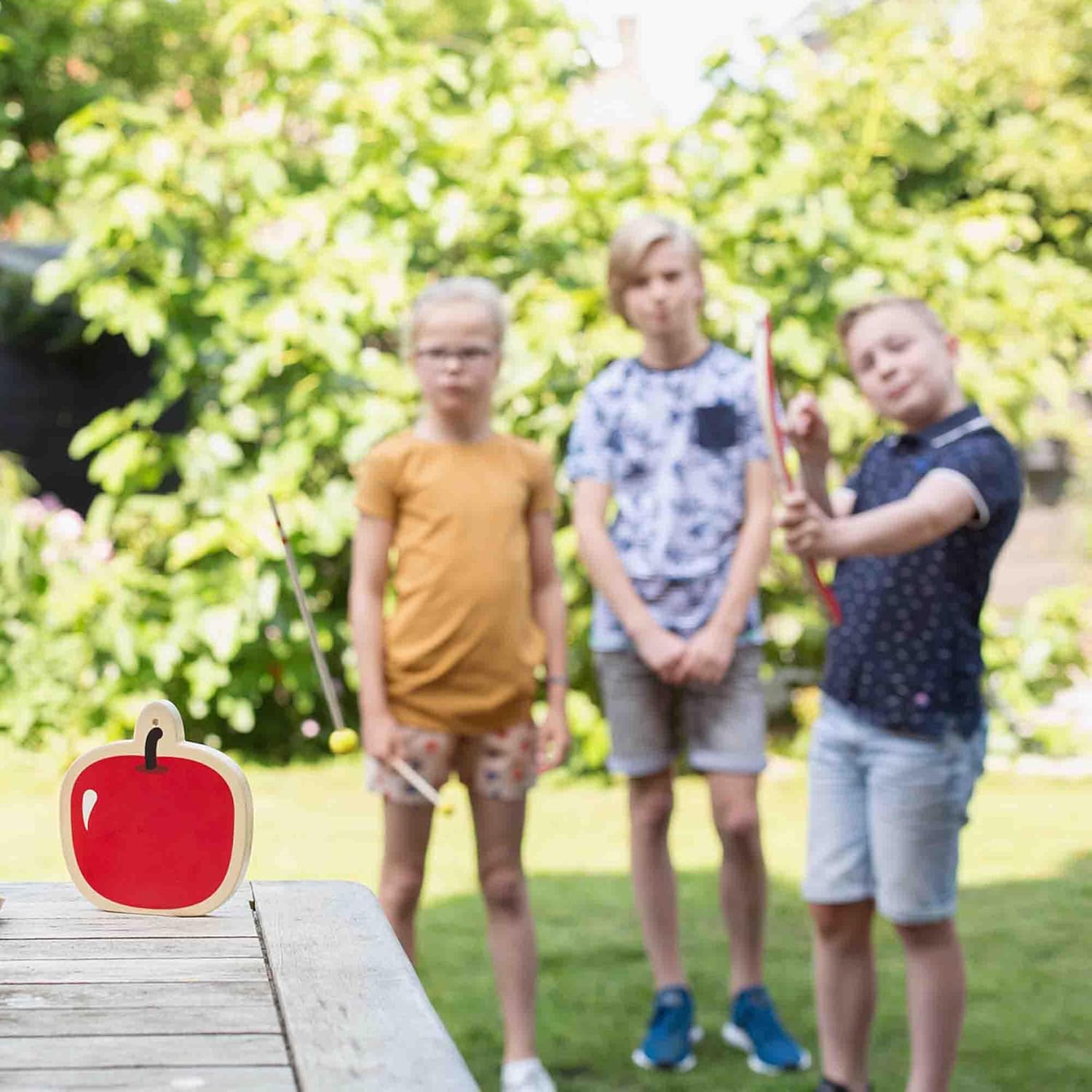 wood | 1 bow 45x12x1,5 cm | 3 arrows 26×2,5 cm | 3 apples 13x13x1,5 cm