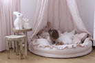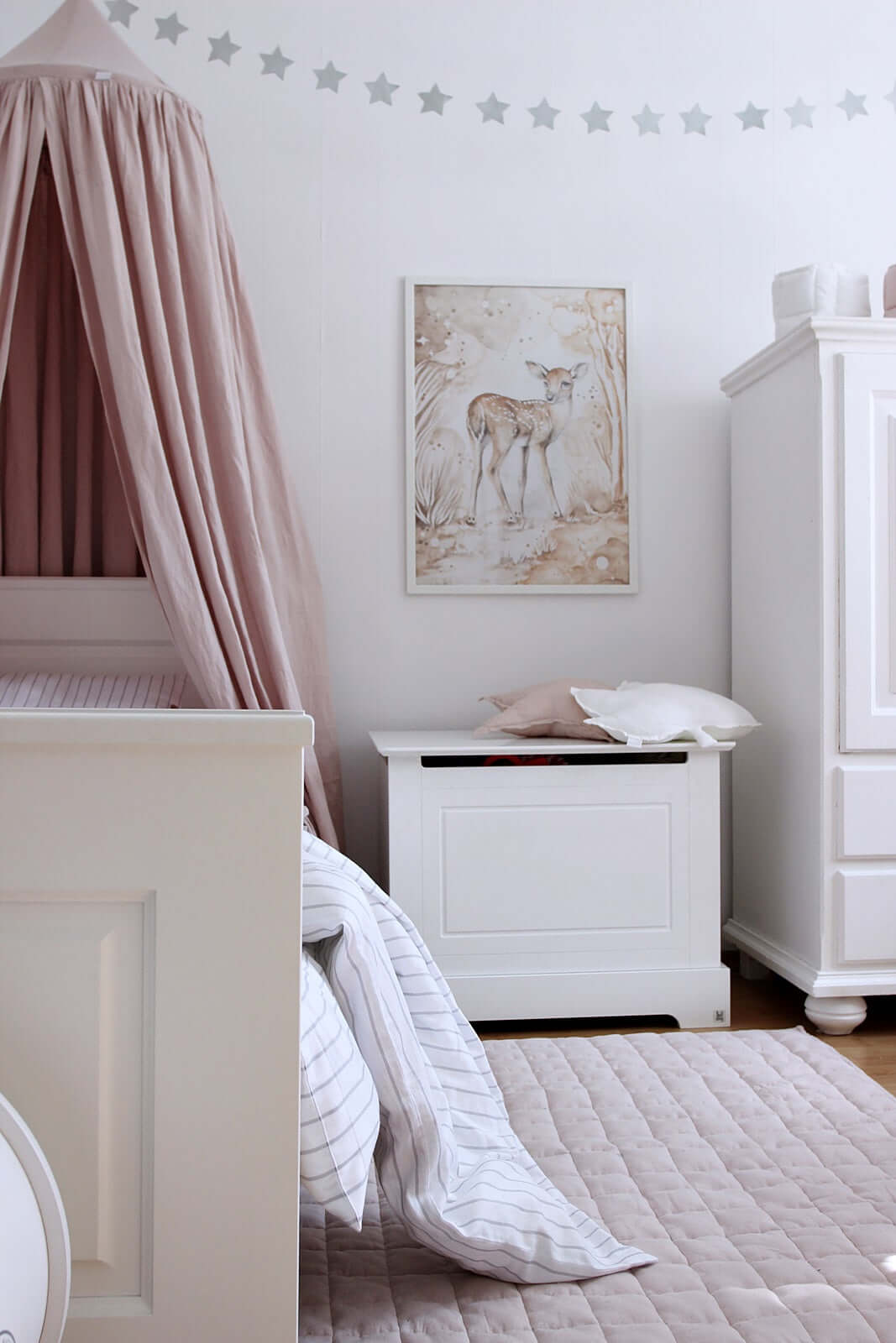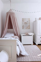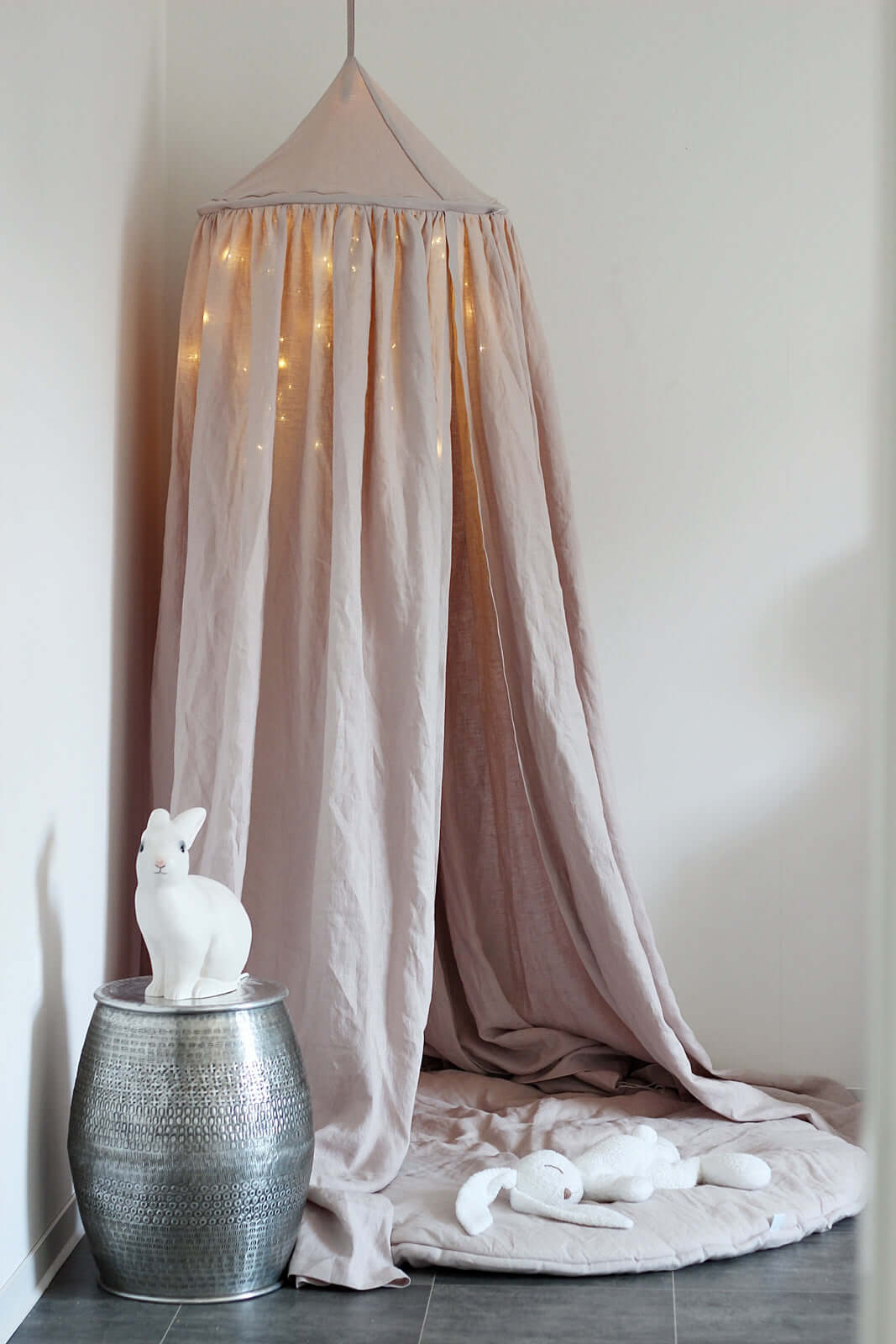A linen canopy Powder pink makes any interior look magical, regardless of whether it is a newborn's room, a children's playroom, or the asylum of a young rebel. There are so many ways to transform your interior with a canopy! In a bedroom, the bed is usually the interior focal point. Make your daughter's bed a real eye-catcher with a powder pink linen canopy. By combining the canopy with a floor mat or Junior nest, you will conjure up a cozy corner for playing and reading fairy tales in the evening. Add a few colorful pillows and voila! Every child dreams of such a safe place!