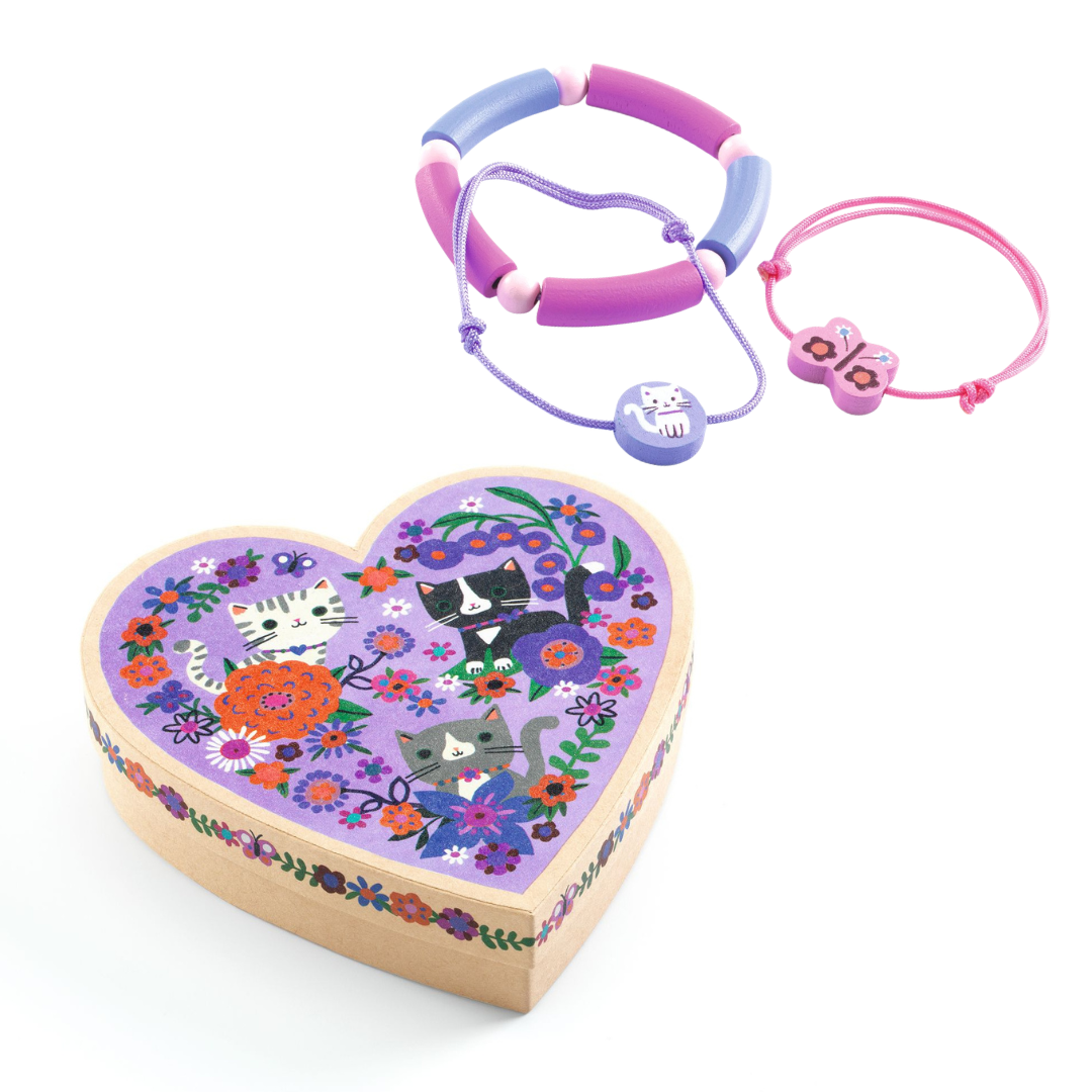 This beautiful heart-shaped box featuring cute little cats has 3 adorable bracelets inside.
