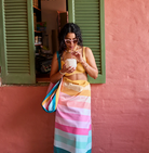Quick-dry towel in coloured stripe pattern.