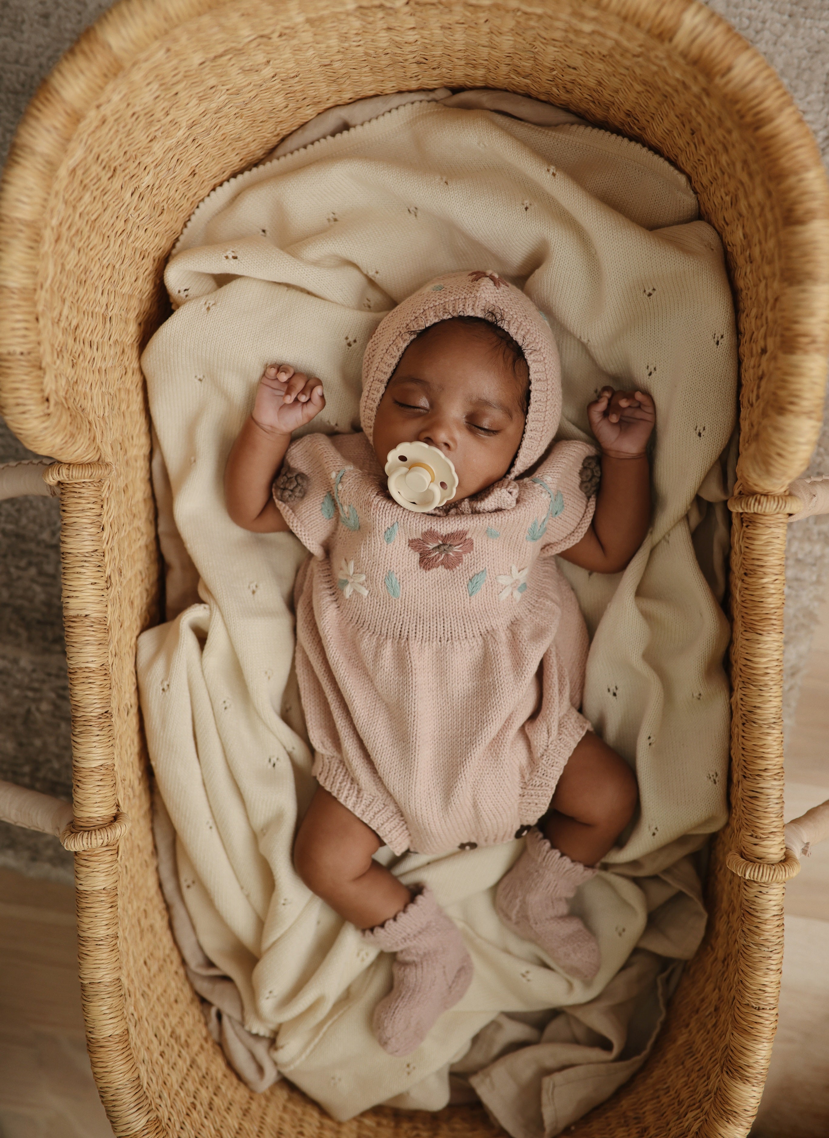 With scalloped edges that mimic flower petals, our Daisy pacifier takes the thoughtful design of our Classic pacifier and adds in a whimsical, charming design.