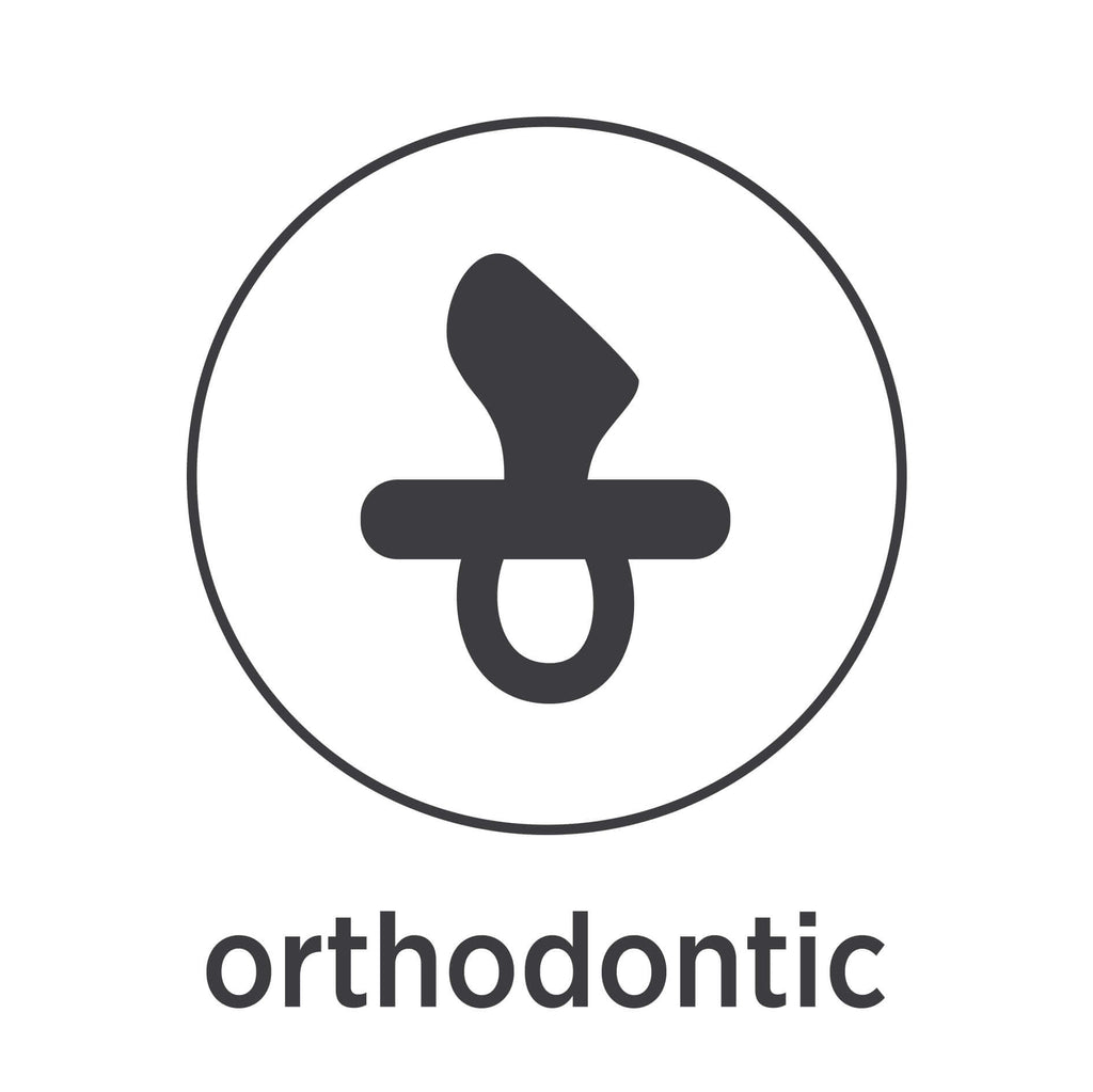 Orthodontic pacifiers are designed to prevent tooth misalignment and orthodontic issues later in life, as baby teeth come in and eventually give way to adult teeth. The pacifier has a flattened bottom and rounded top.