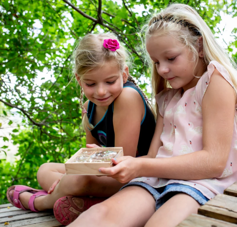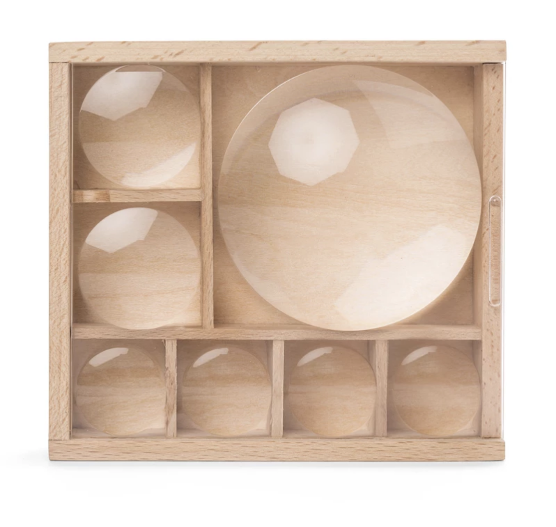 Collect, store, and observe your favorite finds from outdoor adventures! Features 7 compartments and built-in magnifying lenses to take a closer look at your discoveries. 7X (Large), 5X (Medium), and 2X (Small) magnification. Made of beechwood, plywood, and acrylic.