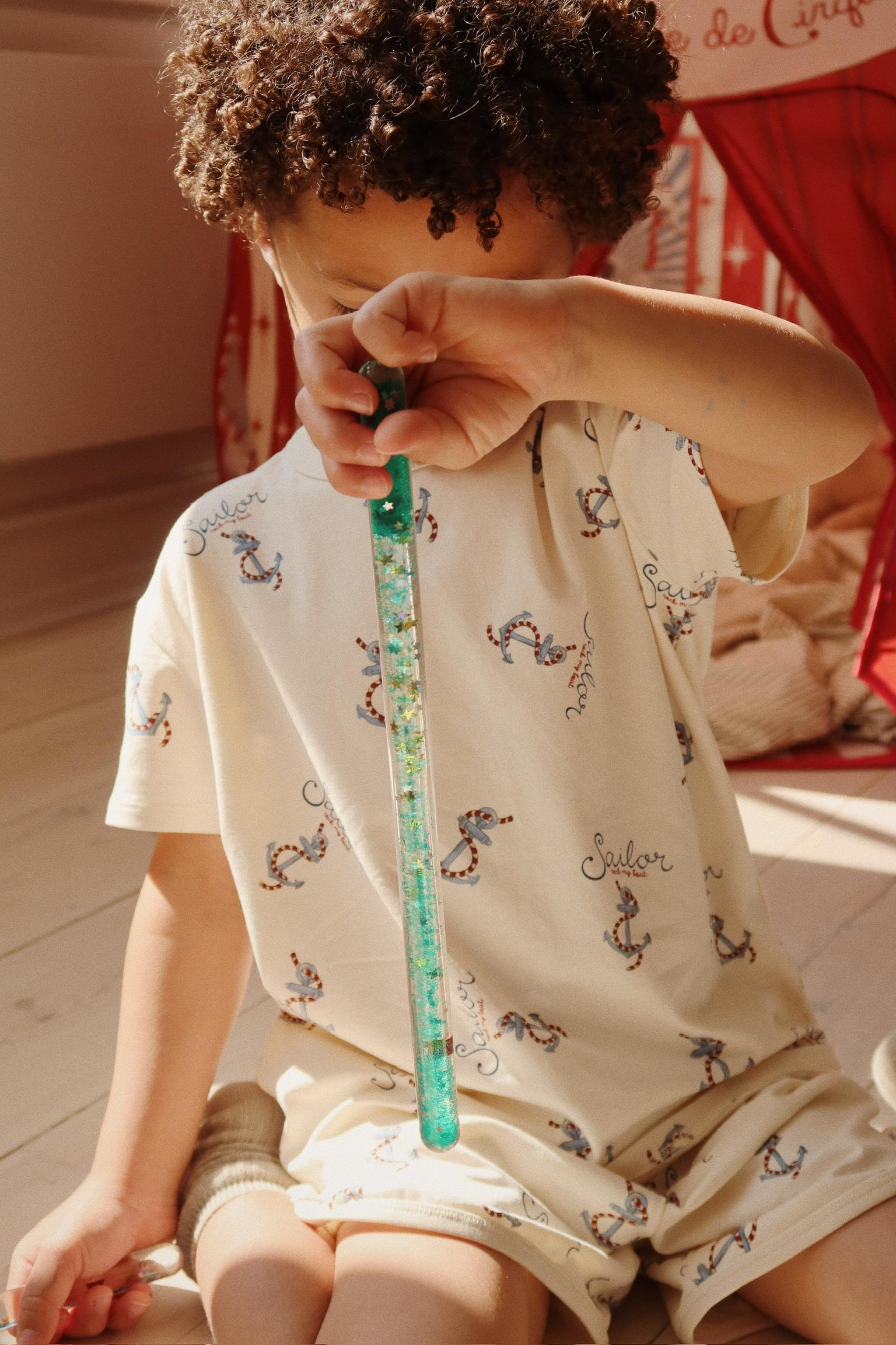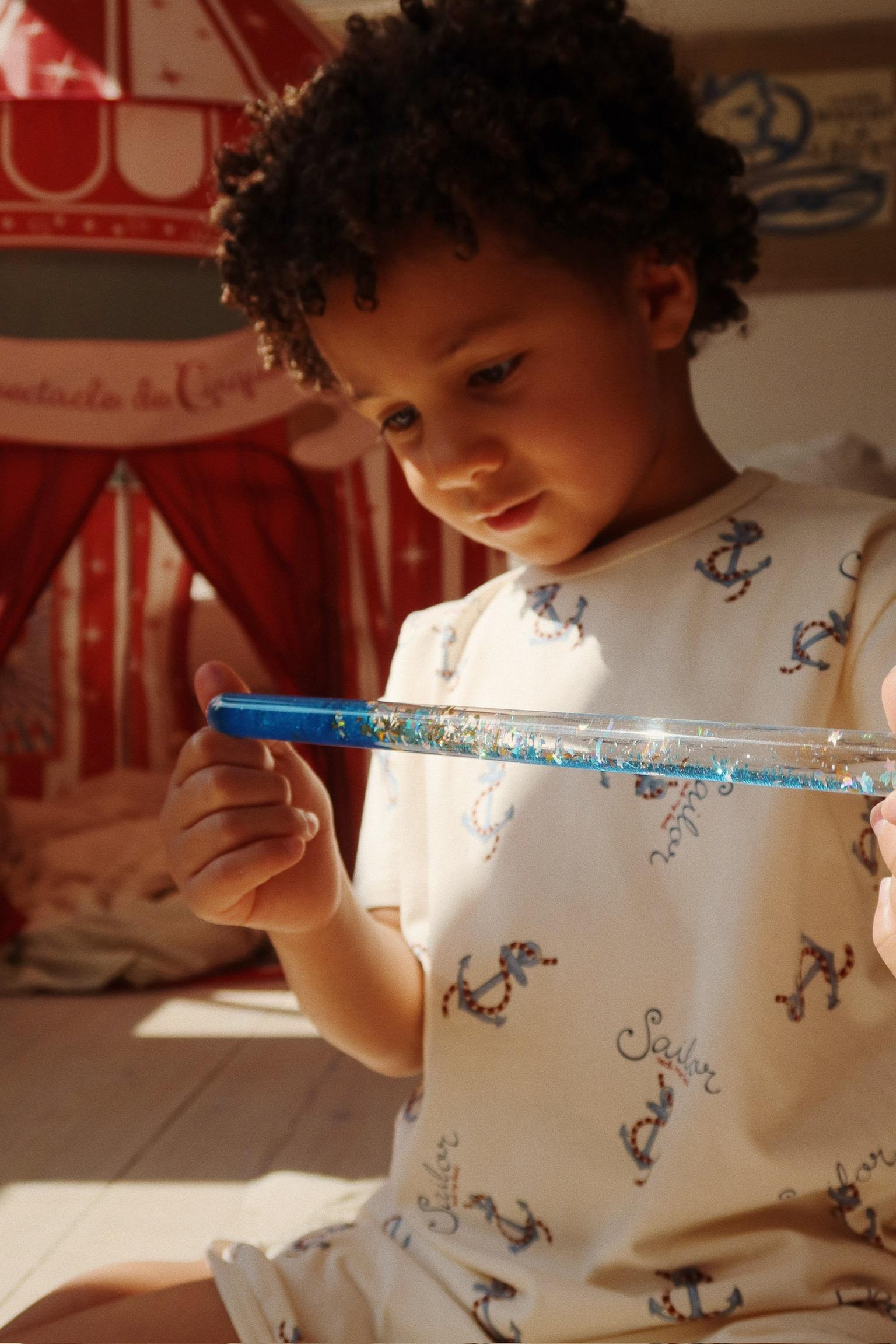 A magical wand with glitter inside. Flip the wand upside down and watch as the glitter twirls and dances. A childhood favorite interpreted the Konges Sløjd way.