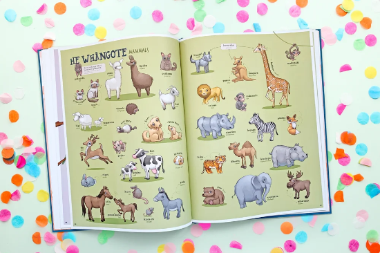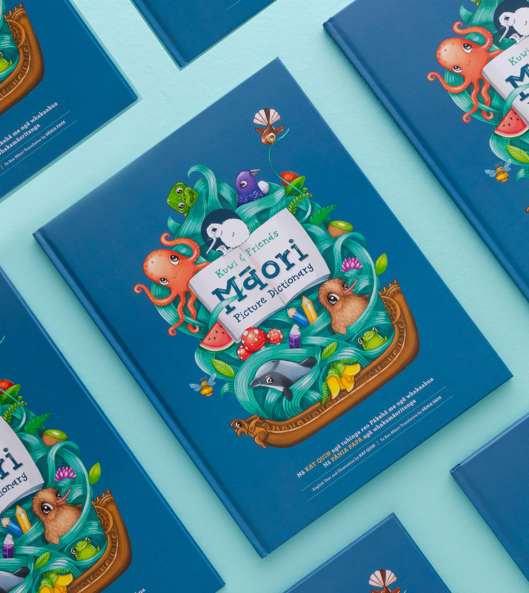 A hard-cover book with 68 fully illustrated pages, in a large format (266 x 320mm), in vibrant full colour, with over 1000 te reo Māori words, translated into English. Embedded with gorgeous Kuwi the kiwi (and friends) illustrations.
