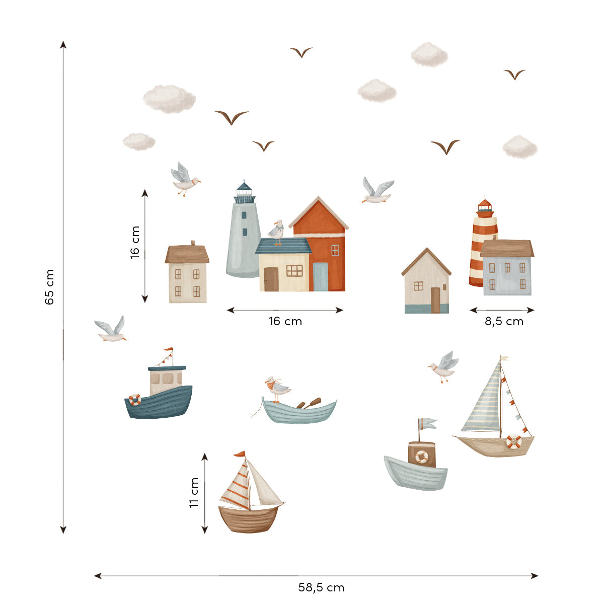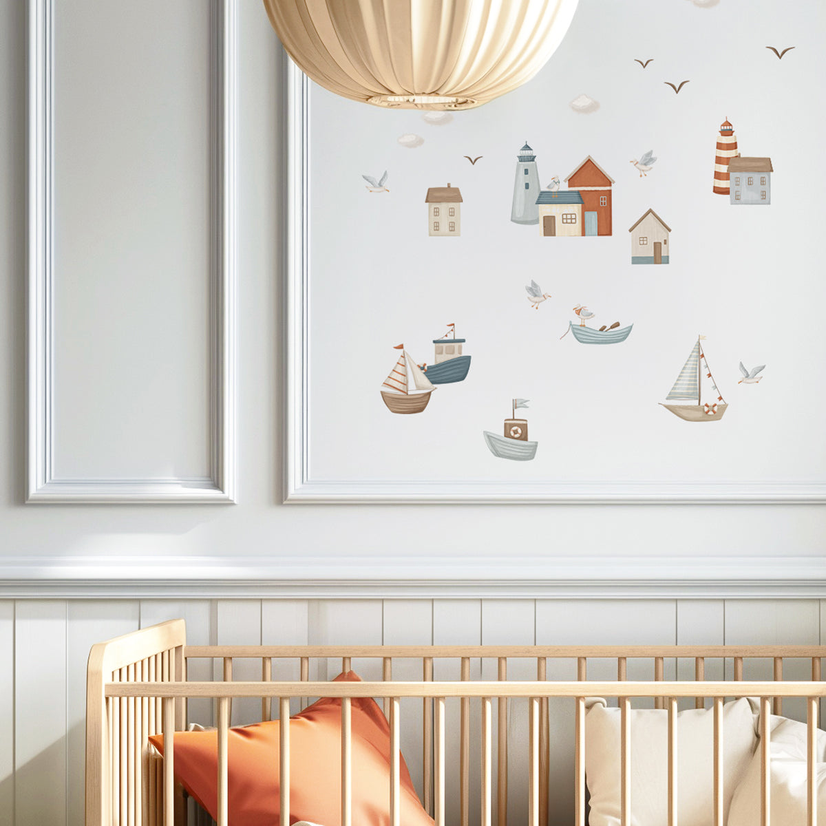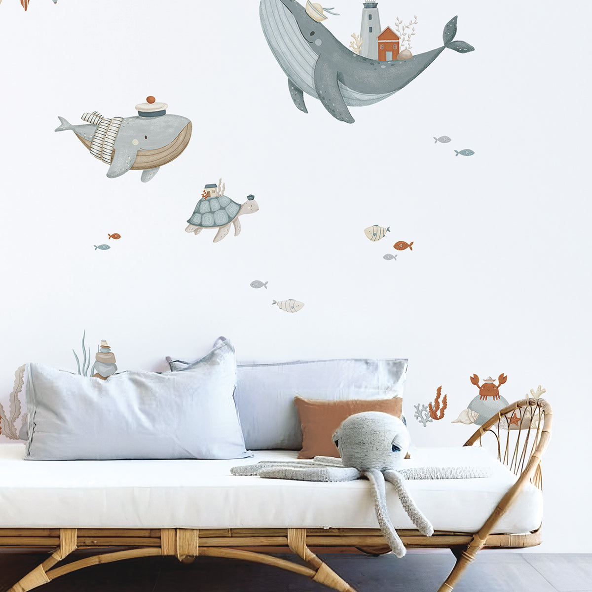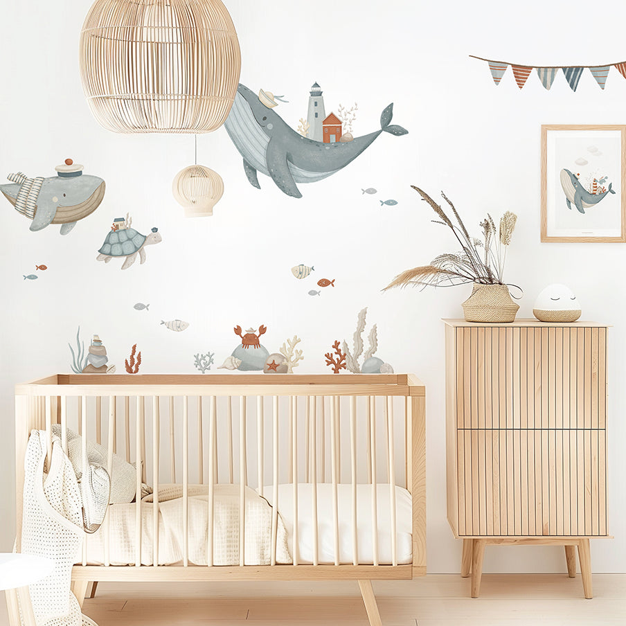 A sincere invitation to discover the ocean's mysteries. Little seaside houses, gently sailing boats, and majestic whales wearing little sailor hats create a scene that is both charming and whimsical. Every element, from the joyful baby whales carrying villages on their backs to the laughing little crabs and waving turtles, is designed with an attention to detail that awakens the imagination.