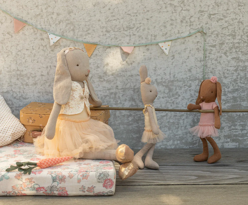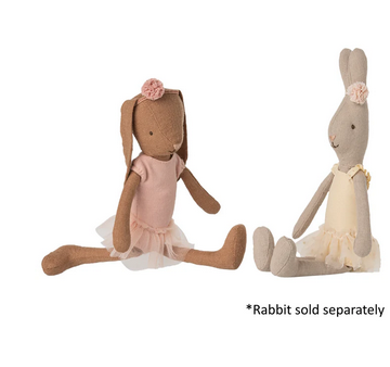 The well known Maileg bunny dressed up as a ballet dancer. It wears a suit, tulle skirt and head decoration.