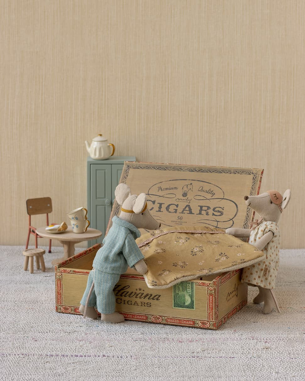 A classic Maileg item. Mum and Dad mice are wearing their beautiful nightwear and eye masks. The cigar box is a perfect bed for a good night’s sleep and sweet dreams. Bed linen may vary in color.