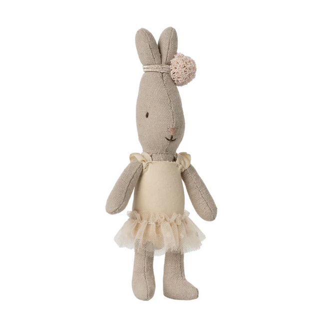 The well known Maileg micro bunny dressed up as a ballet dancer. It wears a suit and tulle skirt and has a small decoration around the pointing ears.