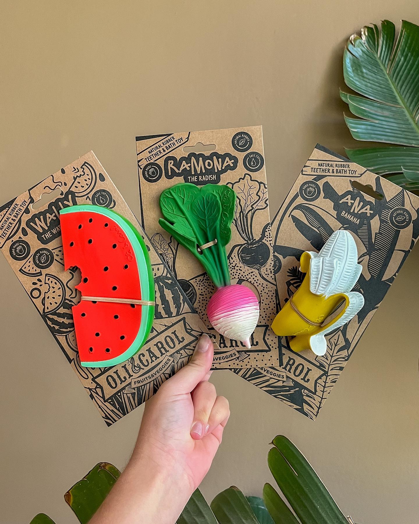 Wally the Watermelon is a fruit-shaped baby teether that will stimulate babies’ senses while soothing little gums. Its realistic textures will develop kids’ sense of touch. It is carefully hand painted with natural pigments, making it completely safe for little ones. Did you know that including watermelon in food helps keep 90% of water in human bodies? Introduce kids into a healthy lifestyle from a young age!