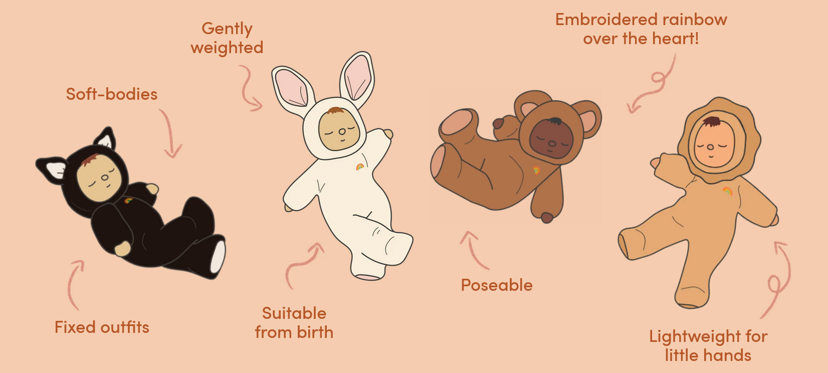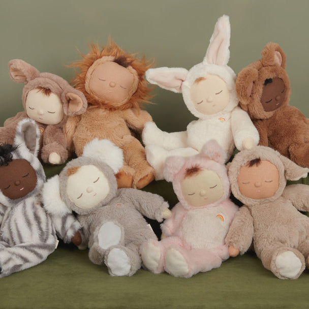 - Cozy Dinkum Dolls wear a non-removable plush onesie with ears and embroidered rainbow over the heart