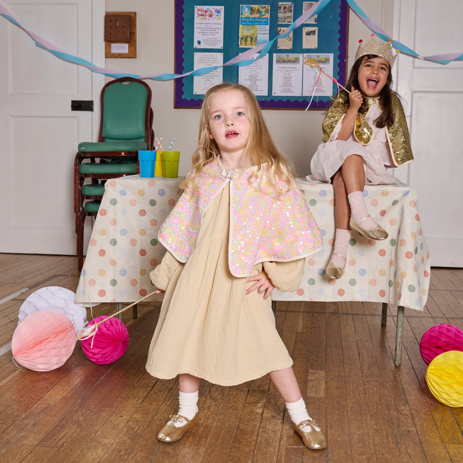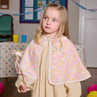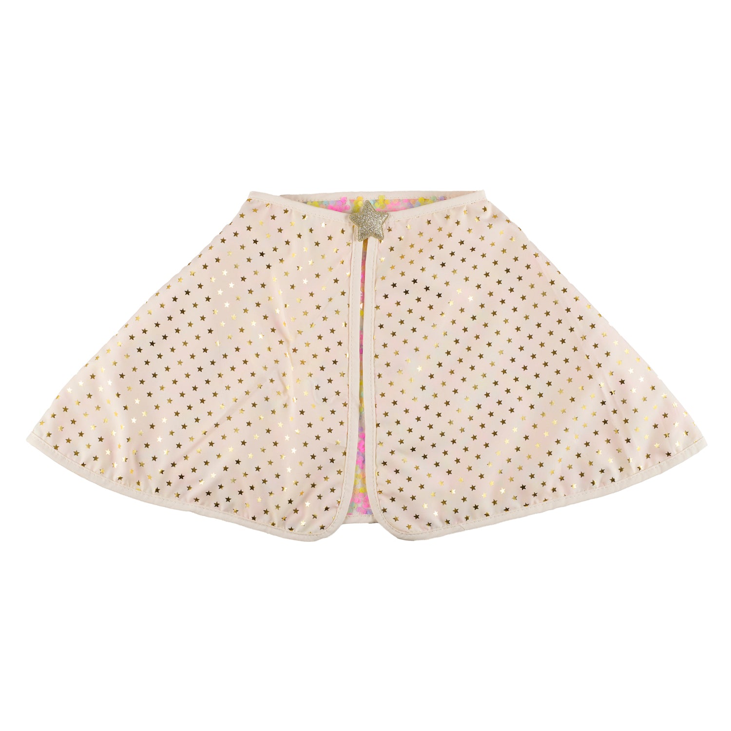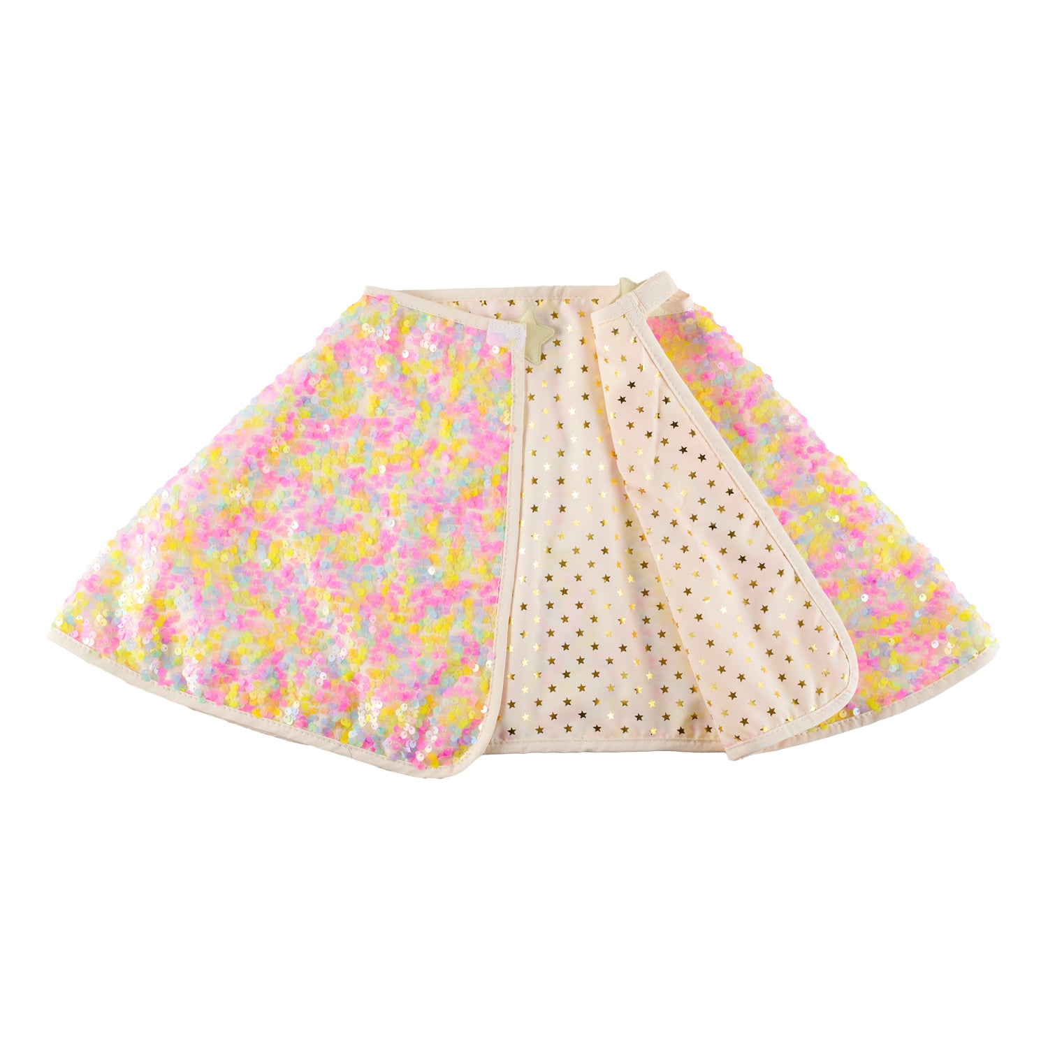 Get ready to dazzle with our pastel sequin cape! Adorned in shimmering pastel coloured sequins with a glittery gold star velcro closure. Fully lined with a gold starry lining, it's reversible for double the fun! The perfect accessory for summer adventures!