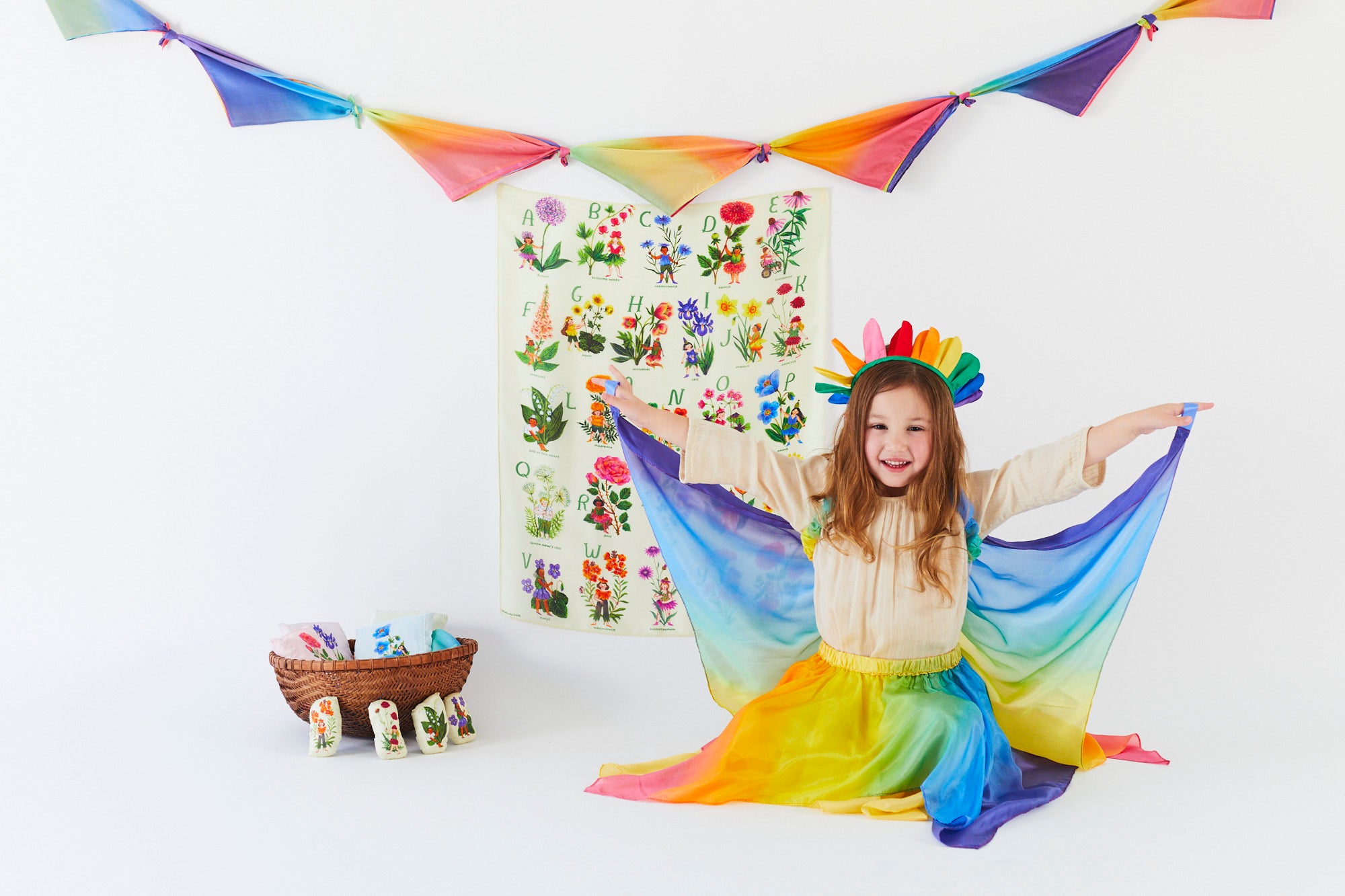Seek & Find Playsilks are 21" x 26", made from heavyweight, 100% pure mulberry silk. Included with every Seek & Find Playsilk are one of a kind cards with suggestions for children to easily begin the seek and find fun!