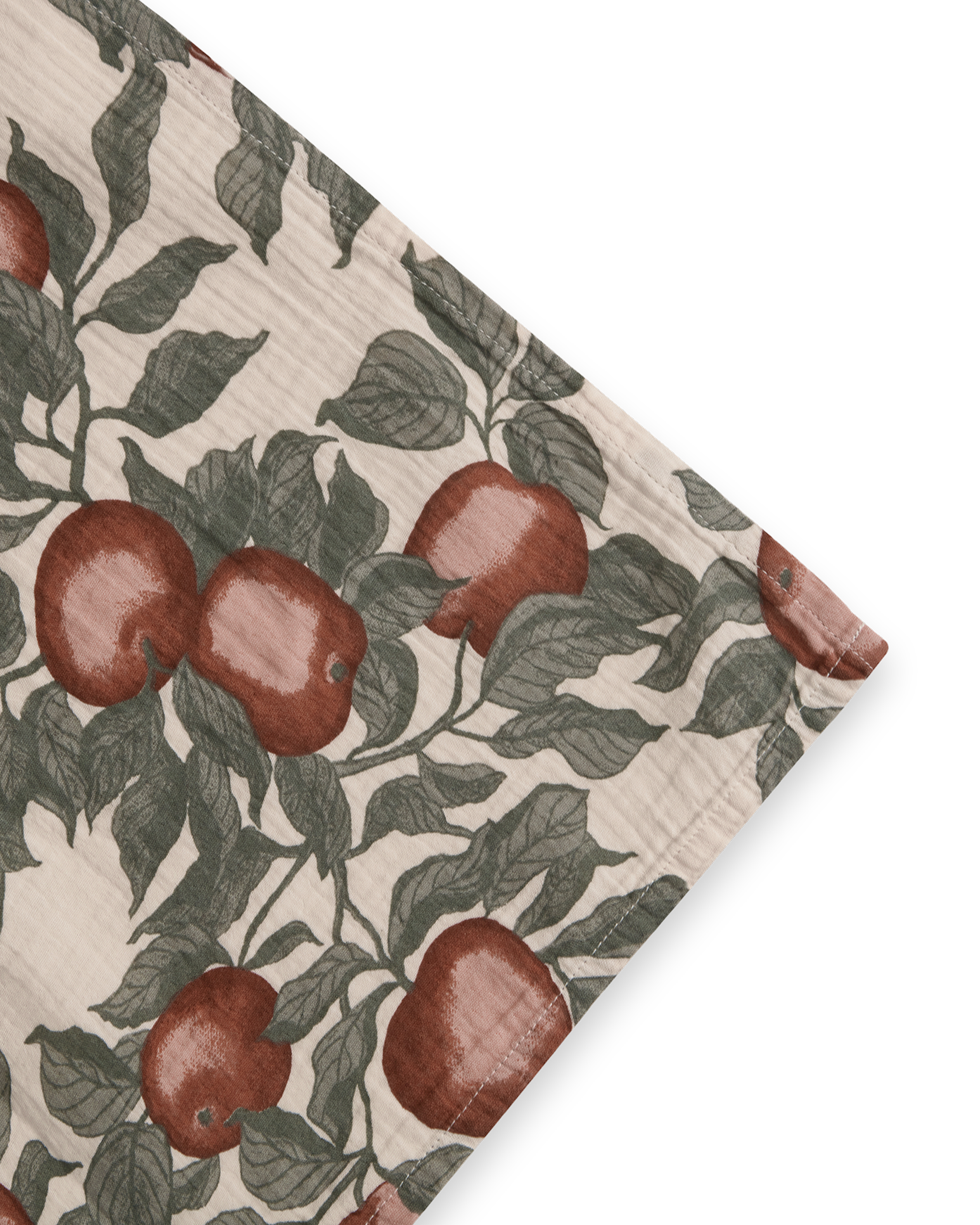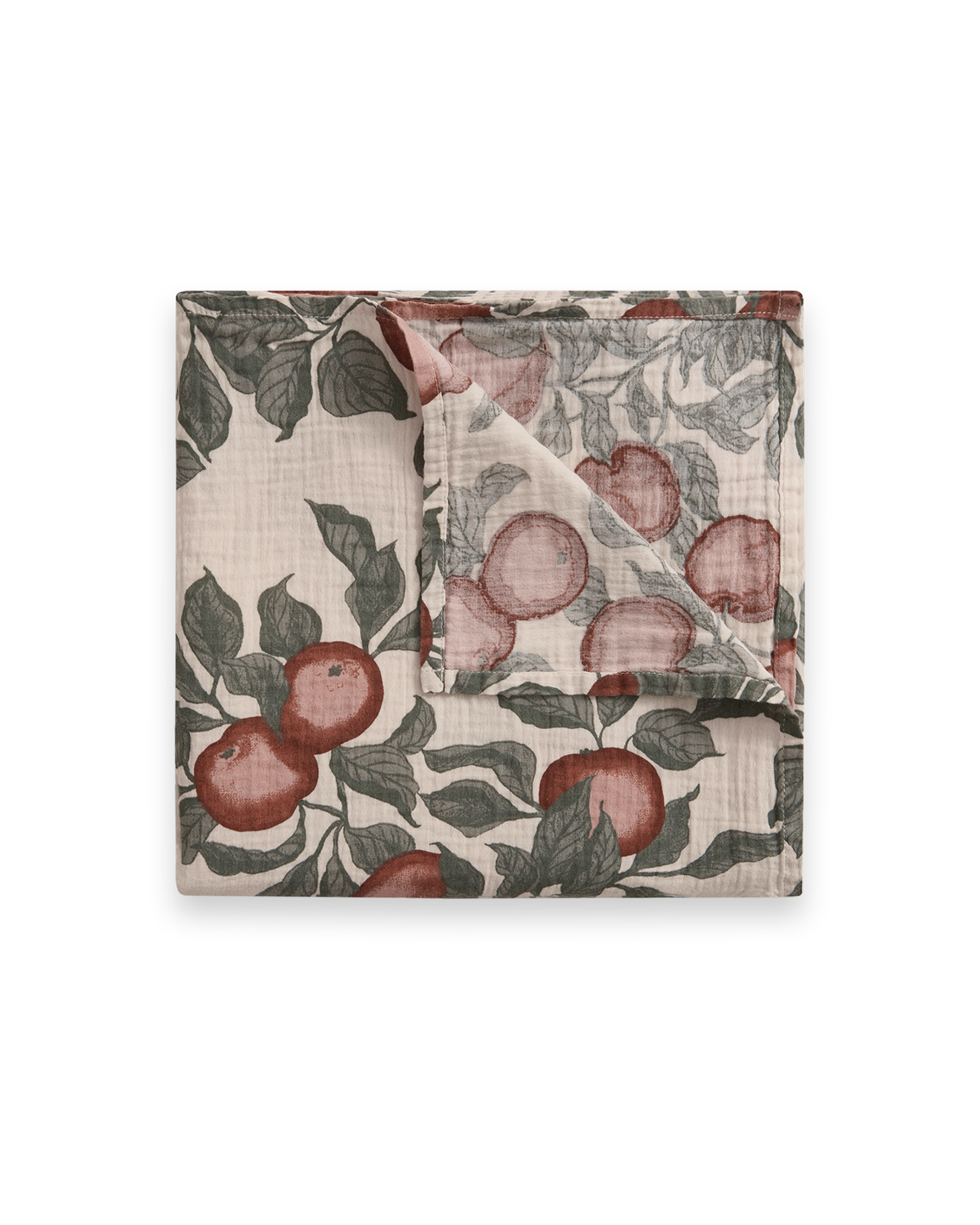 The beautiful blend of shades, capturing the various stages of an apple's growth, from pale, budding greens to luscious, ripe reds pattern creates a striking contrast against the natural off-white or pale cream color of the muslin fabric on this beautifully patterned baby swaddle from Garbo&Friends.