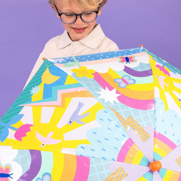 Our super popular Colour Changing Umbrellas in a bigger size! Our mission is to spread more smiles across rainy skies, that's why our unique, bright and FUN designs are now in a 17" format, suitable for age 6 and upwards to dance and prance on rainy days, watching as the white areas turn to colour in the drizzle. So much fun!