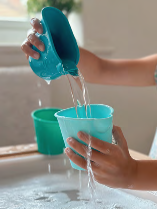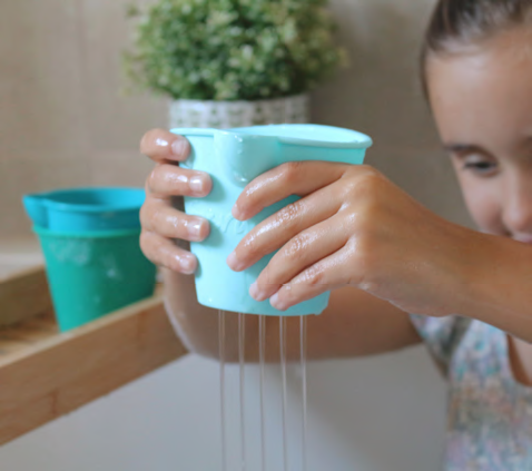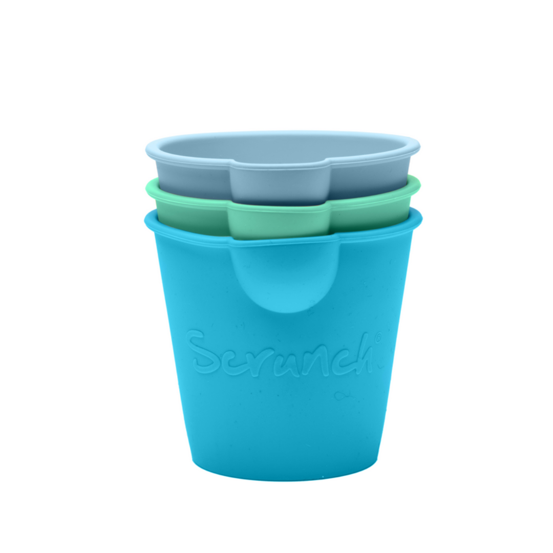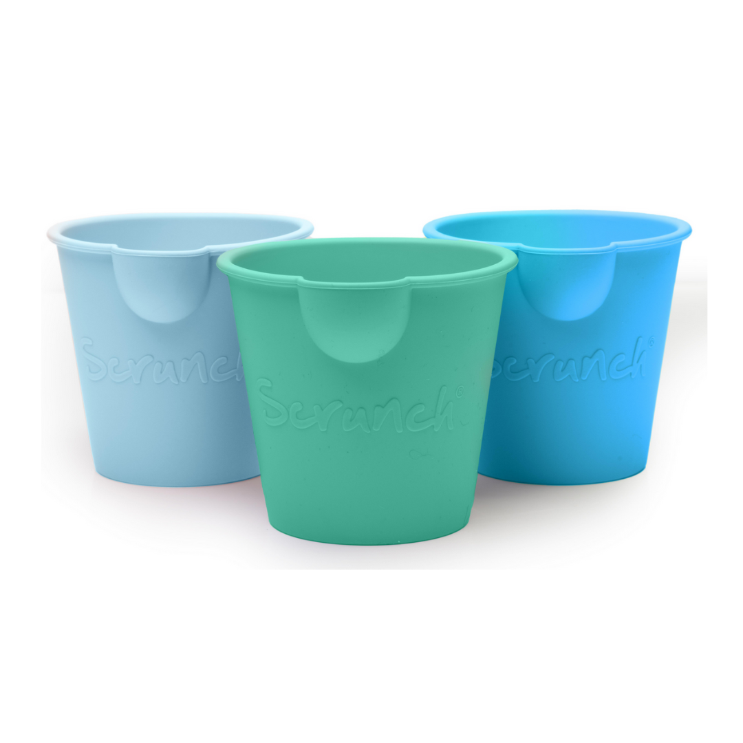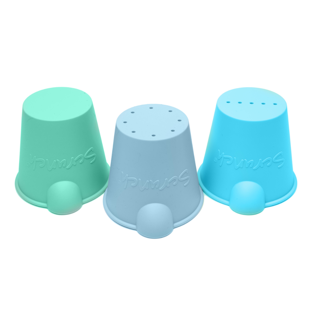 A set of three mini bath buckets with pouring holes from Scrunch Kids. These soft, flexible silicone pourers are perfect for little hands and ready for water play in the bath, pool, garden and at the beach.