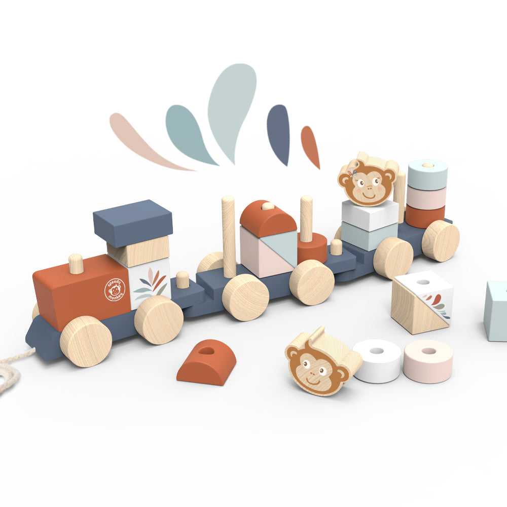 A fun wooden pull-along train stacker, painted in trending soft colors and featuring our favorite character, the monkey. Your little one will have hours of fun, stacking elements on the train and building houses with colorful blocks. Once everyone on board, tchu tchu off goes the train for a new adventure!