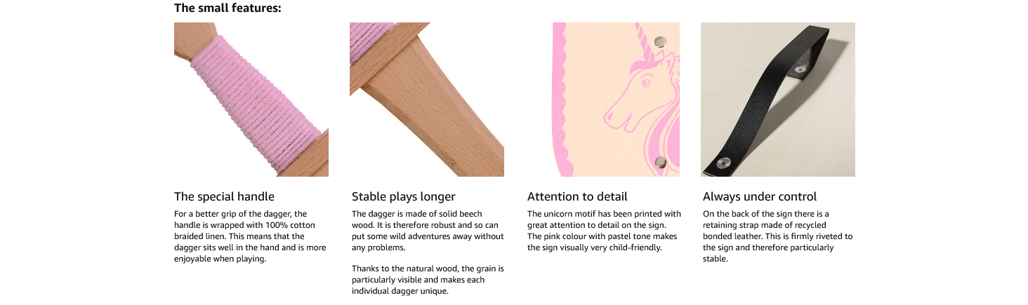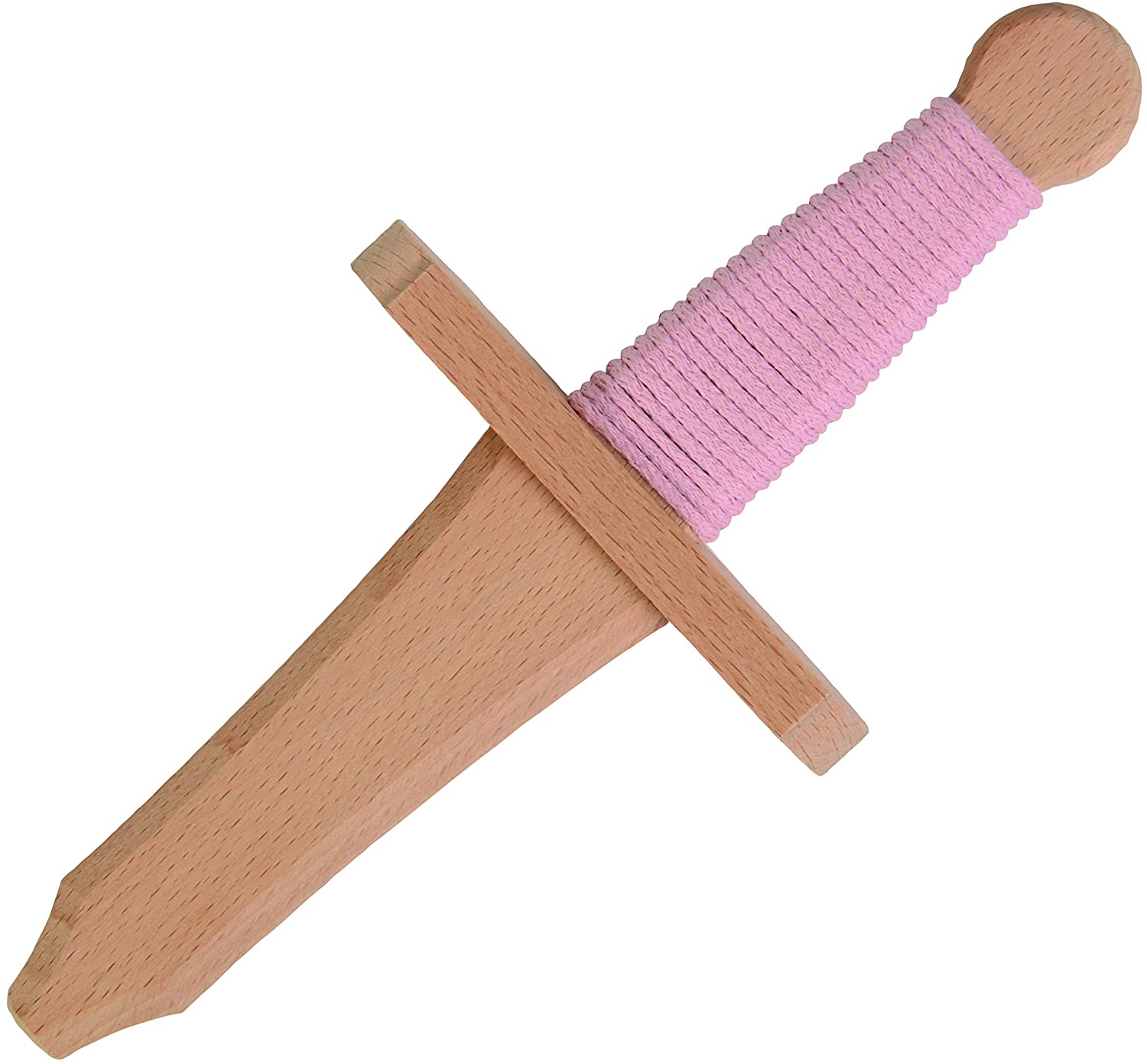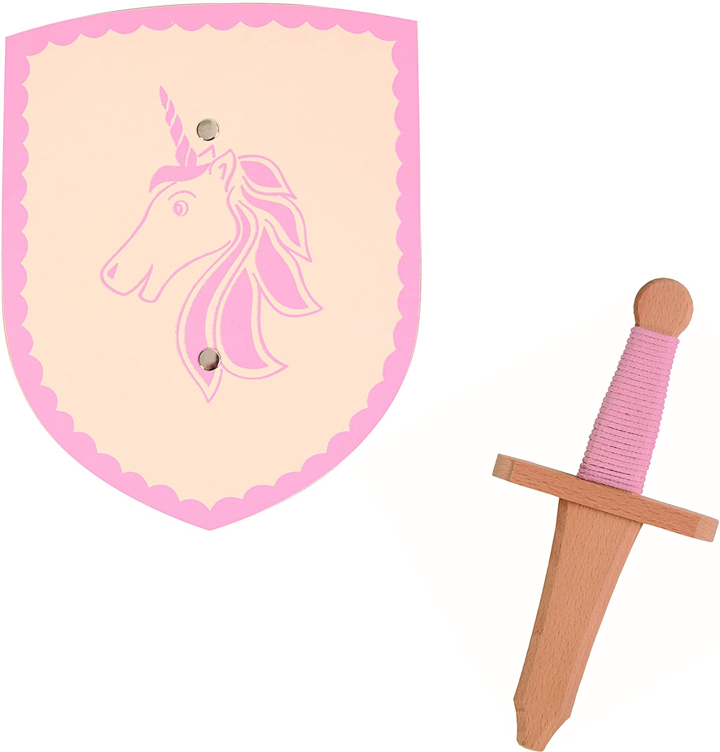 The mini set Isolde in pink consists of a small dagger and sign. The dagger is made of sturdy beech wood and has been manufactured with great attention to detail by the toy factory in Dollnstein, Bavaria. It is the first choice when it comes to quality and durability. The sign is also made of wood and has been printed with the motif of a unicorn. On the back of the sign there is a bonded leather strap which is particularly robust.