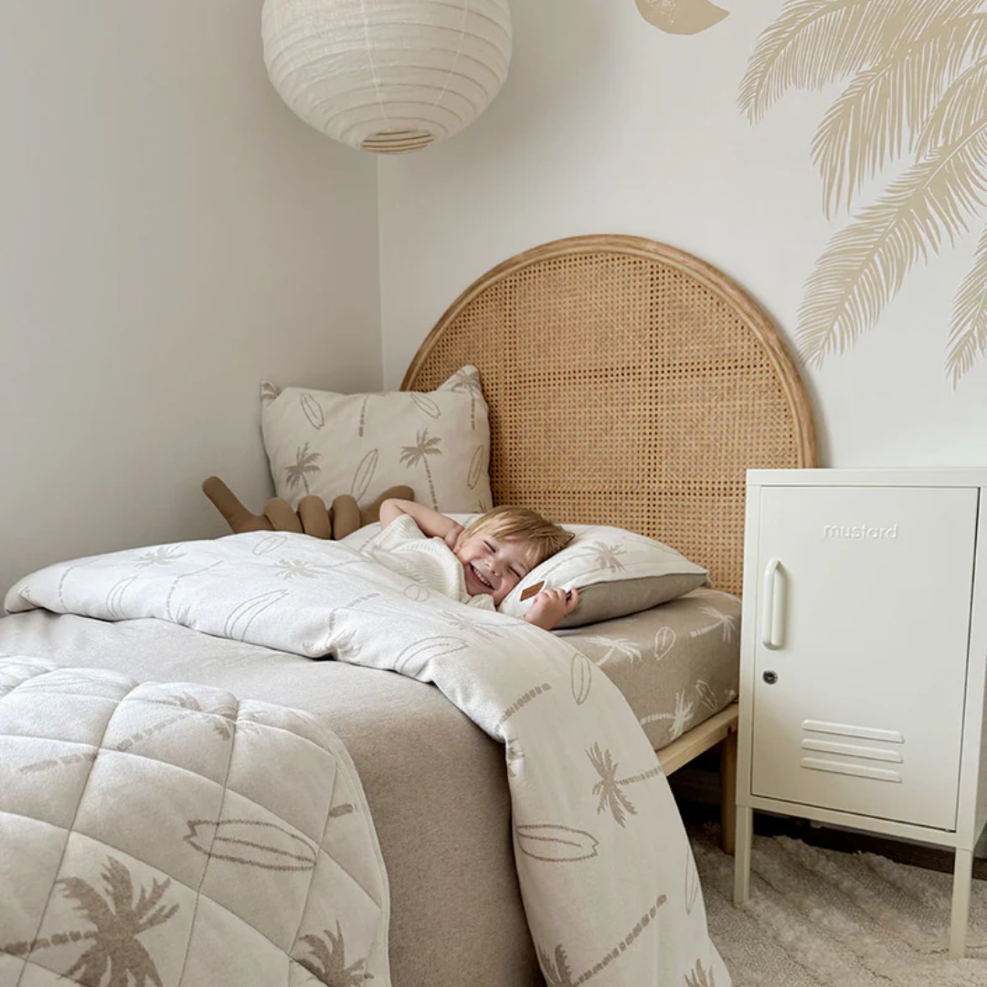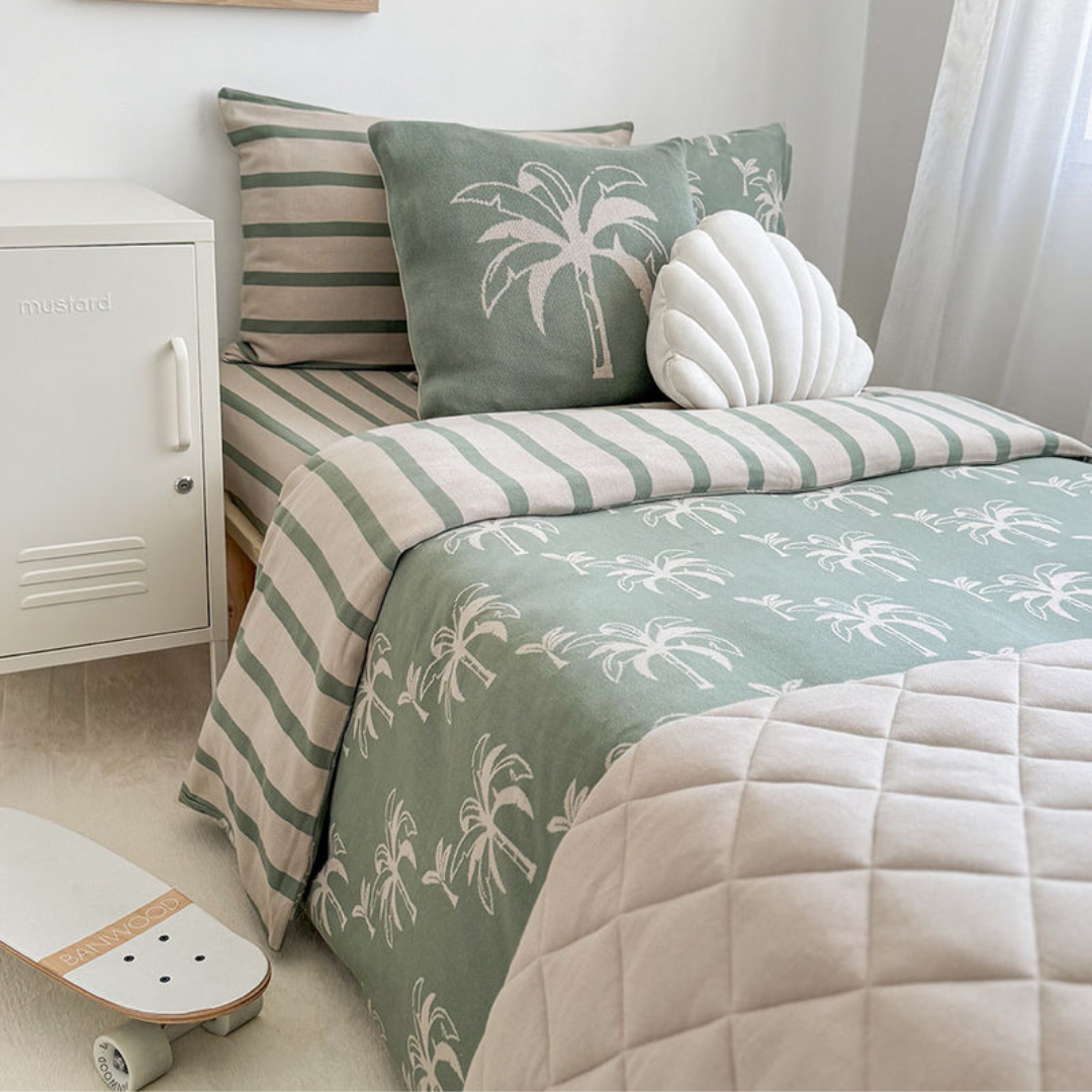 Inspired by sea-worn landscapes, this collection includes king single bedding, pillowcases and cushions designed to bring relaxed coastal style to older kids’ bedrooms.