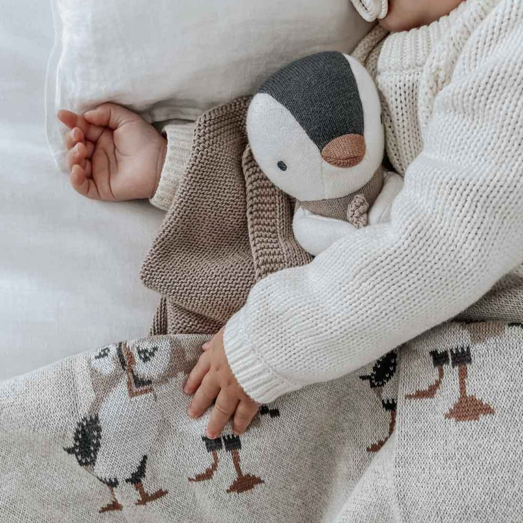 Featuring knitted blankets, cot sheets, soft toys and snuggly comforters.