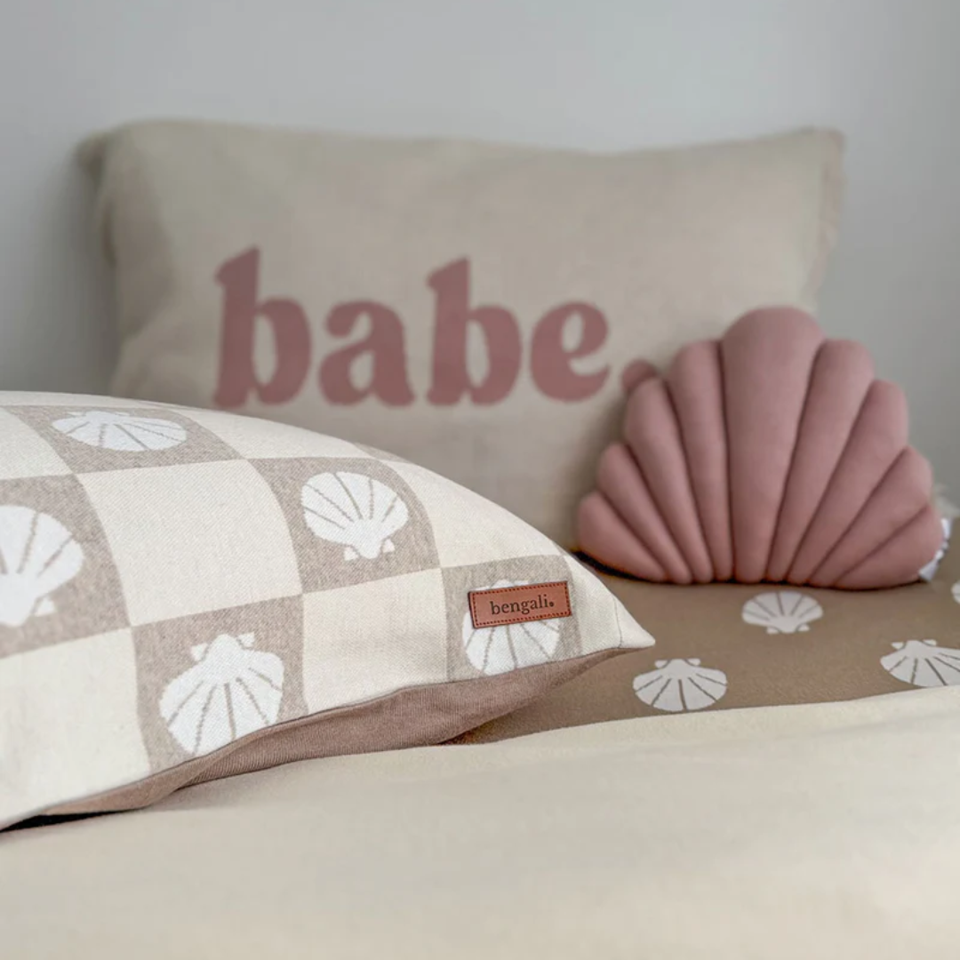Inspired by salt air and slow coastal adventures, Shoreline features soft natural and stone checkers paired with subtle clam shell motifs. Calm, beach-worn tones designed to bring an effortless seaside